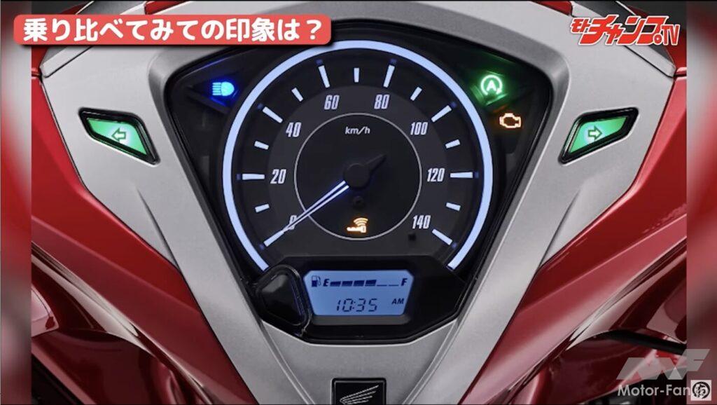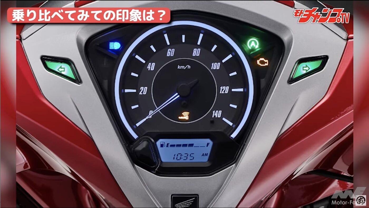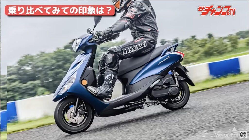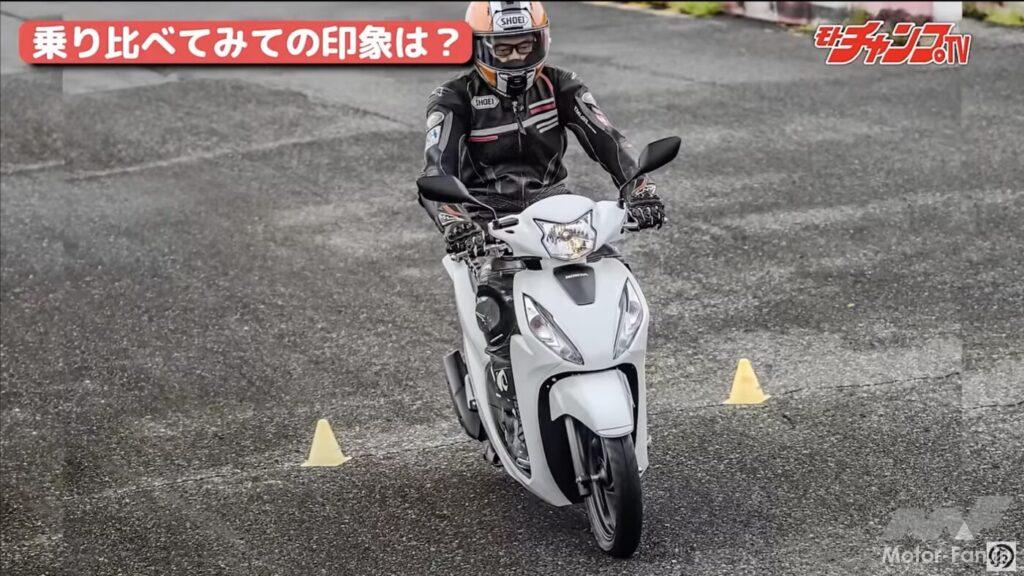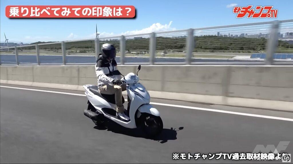 MCシモいわく「パワーがない」ことがディオの残念ポイント。スロットルをワイドオープンにしても、得られる加速力に見るべきものはない。そこが実は普通に乗れる通勤通学モデルとしての美点であるのだが、やはりスクーターレース経験者からすると物足りなさになるのだろう。ただ、パイロンスラロームをしても突出した面がないため、どこまでもニュートラルな印象とのこと。また真横から見ると良くわかるが、ホンダの2車はキャリアとシート後ろがフラットになっている。積載性という面ではヤマハの2車より有利だろう。