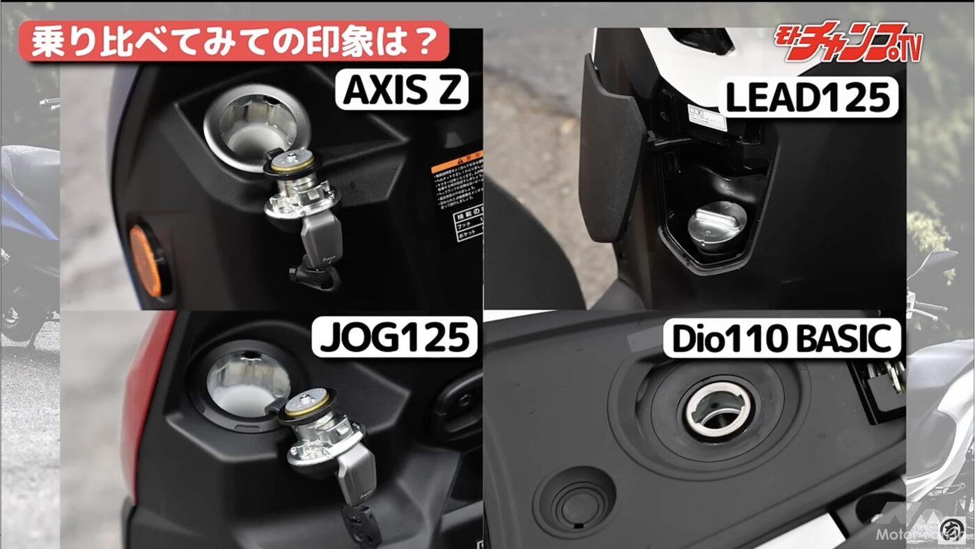 では実用性でいうとどうだろう。いずれも無鉛レギュラーガソリン仕様で、タンク容量はディオが4.9L、ジョグが4.0L、アクシスZが5.5L、リードが6Lとなっている。燃料タンクが最も小さなジョグだと給油回数が多くなりそうだ。だが問題は給油口。ディオ以外の3車はフロントカウル内側に位置しているのだが、ディオだけはシート下にある。そのため給油のたびにシートを上げ下げしなければならない。