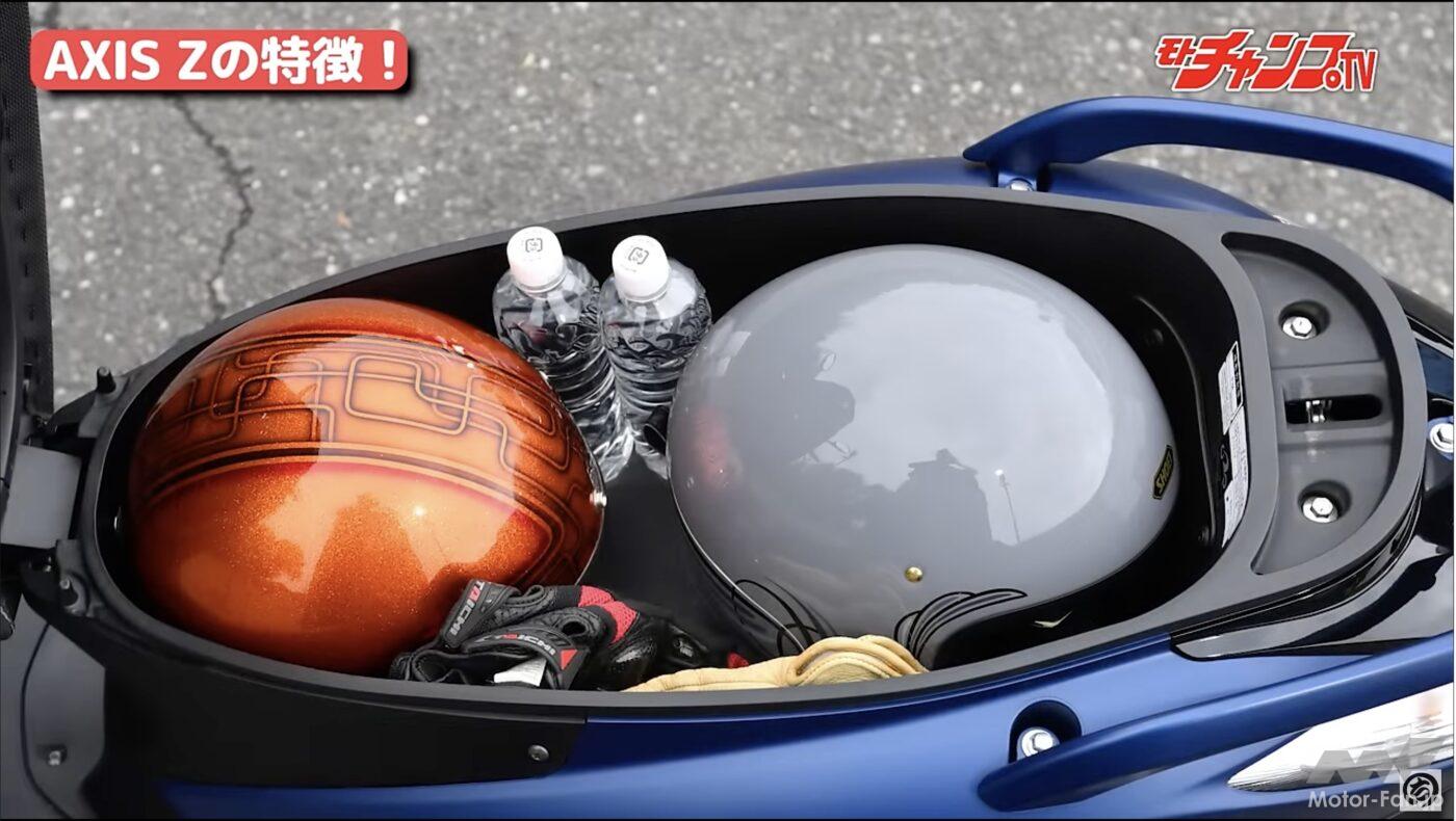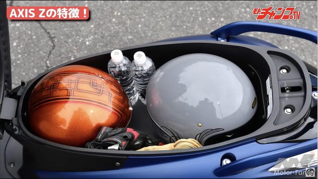 ケニー佐川としては10インチならではの特性が気になったそうで、例えばフロントブレーキだけで強めにブレーキングするとタイヤがロックして転びそうになる。確かにクイックな操縦性は魅力であるのだが、小径ホイールの切れ込むハンドリングが合っていなかったそうだ。だが、4車中最もシート下スペースが大きいことは魅力で、4車いずれもフルフェイスヘルメットは入らないが、アクシスZだけはジェットヘルが2個収納できる。これは大きなアドバンテージだろう。
