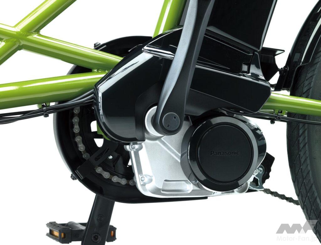 電動アシストユニットには、パナソニック サイクルテック社製のセンターモーターを採用し、パワフルな加速ときめ細かな制御による乗りやすさを実現している。充電当たりの走行距離は、ロングモードで103.1km、オートモードで58.3km、パワーモードで54.6kmとなっている(JIS D9115 標準走行パターン)。