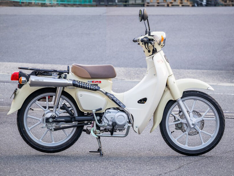 ノーマル同様のダウンタイプに設計されたオールステンレスマフラー。小ぶりなメガホンサイレンサーがスーパーカブならではのスタイルをキープ。