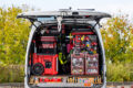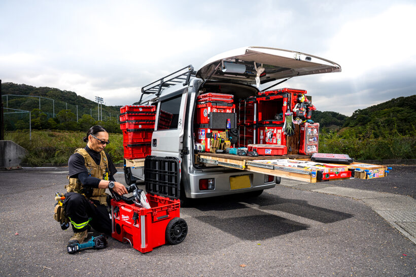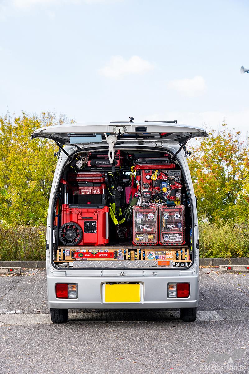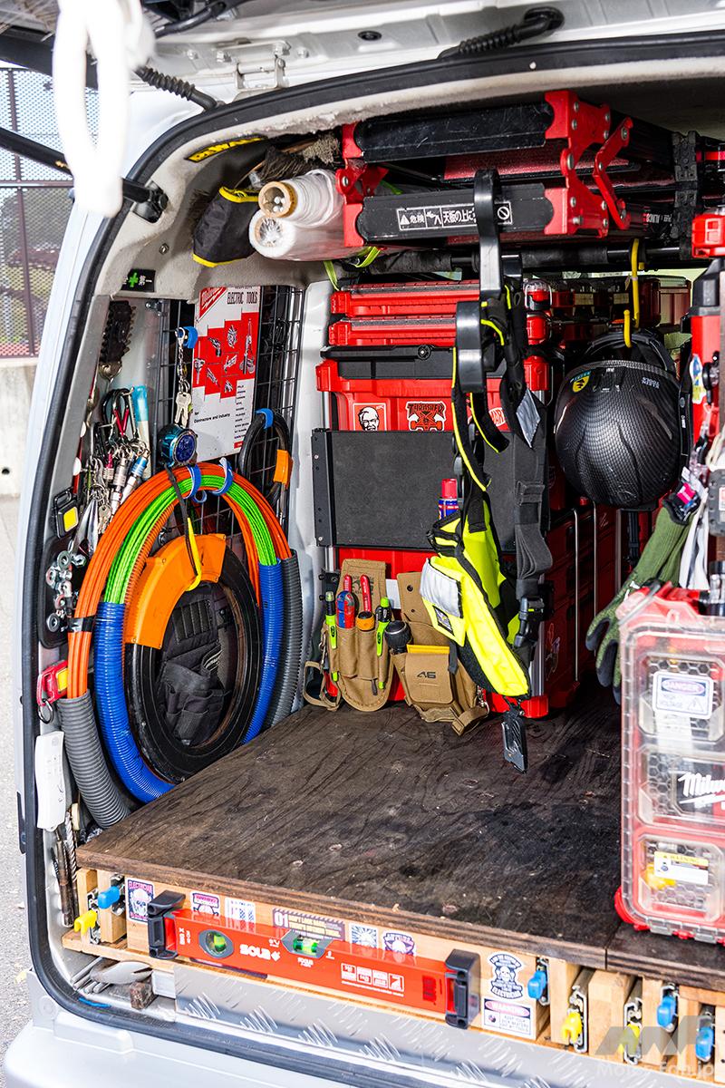 カスタム アカシア材で耐えられなかった天板はどうしたの!? これぞ究極の収納美! ベテラン電気工事士の愛車『エブリイ』がヤバい【写真・3枚目】 右スライド側にできるウォール裏はスペアバッテリー収納に利用。わずかなデッドスペースも見逃さず、使い勝手とともに収納力を高めている。 SUZUKI エブリイ(DA17) 大半が外構未整備の現場でボディが汚れやすいこともあり、エクステリアはリップスポイラーでのアクセント付けや黒のルーフキャリアへこだわった程度だ。 アカシア材で耐えられなかった天板は住宅の高剛性床材「ネダノン」で強化。商品名記載を消すためにオイルステインで色つけした。 大容量のキャリー式ツールボックスには電動工具類を詰め込み、そこへ必要に応じてパーツキャビネットなどをスタッキングしていく。 リアゲートも貴重な収納スペースの一つとして、ペーパーウエスや作業灯などをレイアウト。ぬいぐるみをぶら下げる遊び心も忘れない。 天井には〝脚立界最軽量〟とされるアルインコの4尺&5尺を収納。ミルウォーキーとリンクする黒×赤カラーもお気に入りのひとつだ。 バッテリー収納にも活用していたウォール奥はレール収納時にスライドドア側からケミカル類が素早く取り出せるレイアウトだ。 スライドを開けたステップまわりにはワークブーツやクランプクリップなどを整然と収納。バスケット類も黒や赤で統一する。 動きの渋かったレールは引き出し量が少なめで問題ないリアシートの横スライドで活用。安全に積み下ろしできるよう歩道側引き出しだ。 左側引き出しは電工ペンチやドライバー、ワークテーブル内蔵で深さが稼げない右側引き出しはモールテープやシーラントなどを収納する。 ちょっとした作業に活躍するワークテーブル。木目が美しいアカシア材の風合いを活かしつつ、ステッカーでおしゃれに仕上げてきた。 OWNER 岩田将義さん USブランドのアトラス46でワークウエアを揃えるなど、工具や積載、ファッションにまでこだわる岩田さん。地元の香川だけでなく各地を駆け回るベテラン電気工事士だ。 この画像の記事を読む