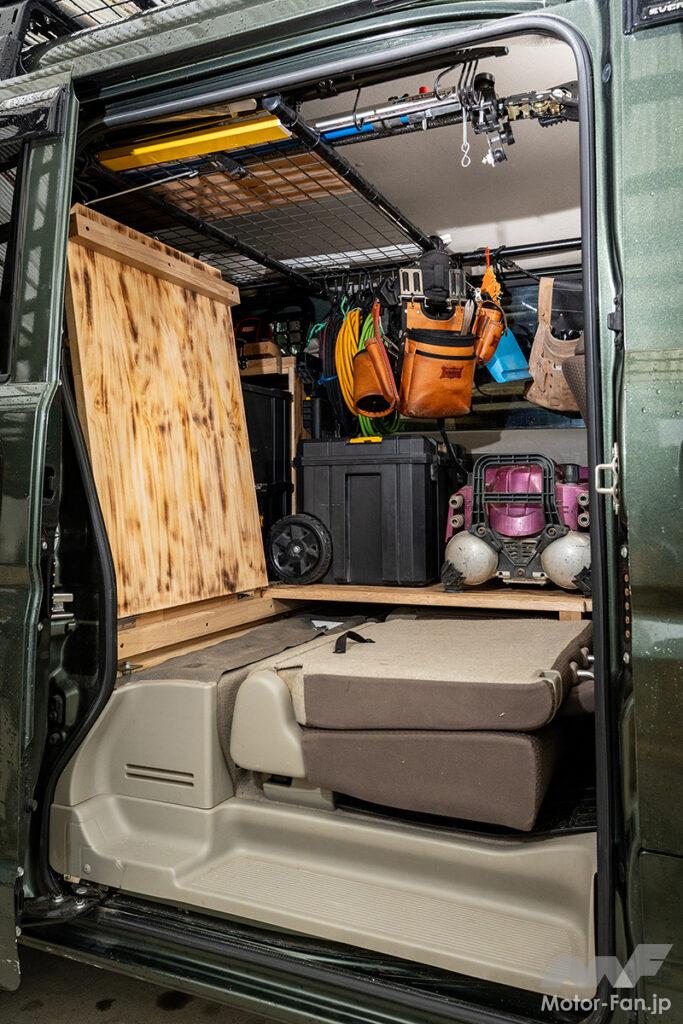 ちなみに数ある軽バンの中でエブリイを選択するに至ったのは仕事道具を積載できるだけでなく、狭い路地先の現場へもアクセスしやすい機動力を求めた結果。加えて、クルマいじりに欠かせないカスタムパーツの豊富さもポイントになっているのだとか。