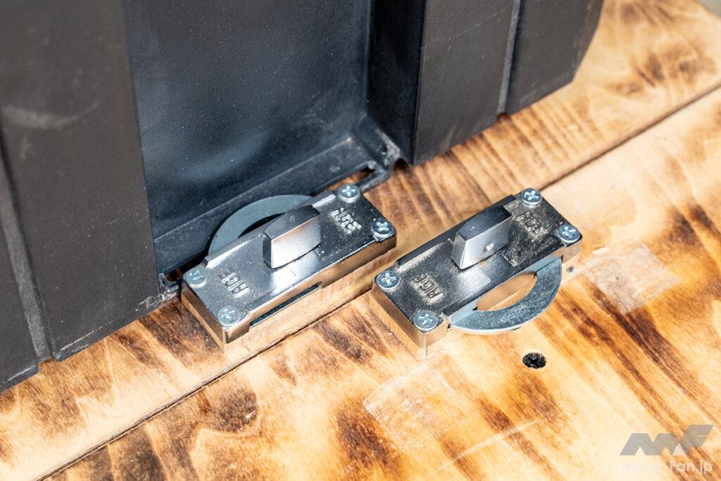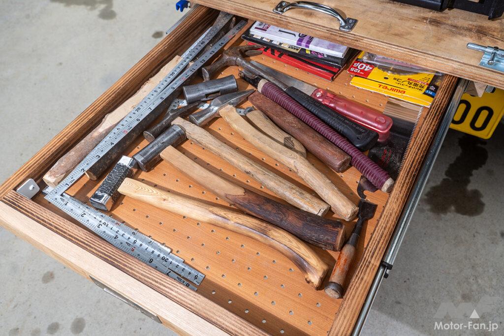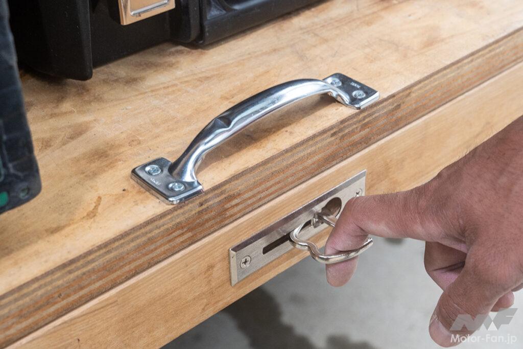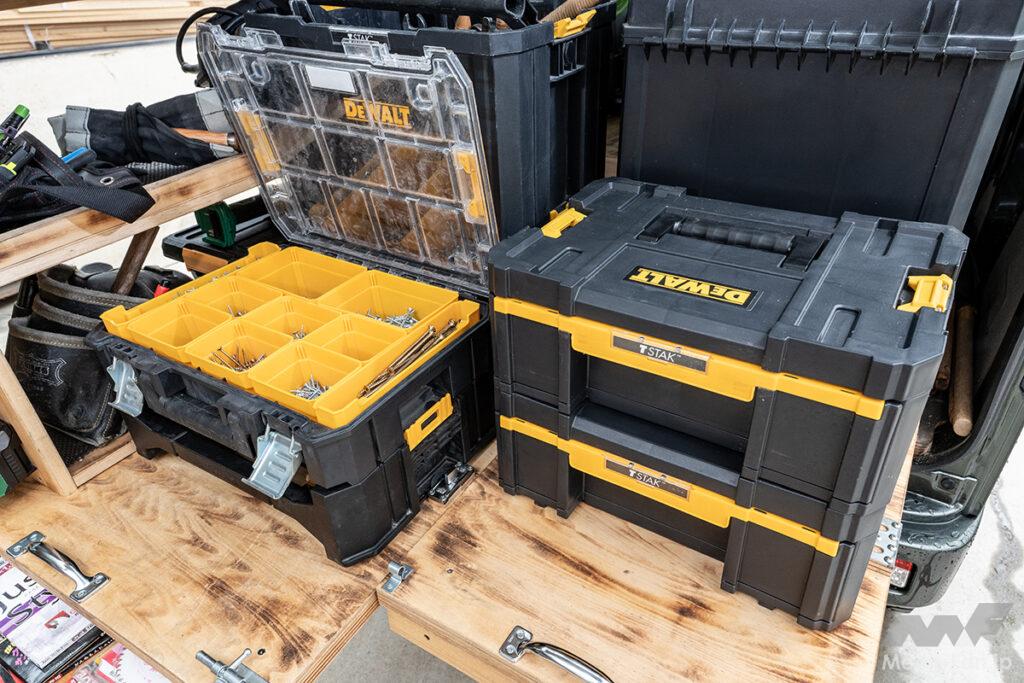 また、ボード上に載せるストレージはDeWALTのTSTAK(ツスタック)で統一し、まとまりの良いカッコ良さと機能性を両立。使用する木材はバーナーで炙って焼き目を入れることで渋味も演出し、取っ手やロックなどは家庭用を用いることで暖かみを感じさせている。