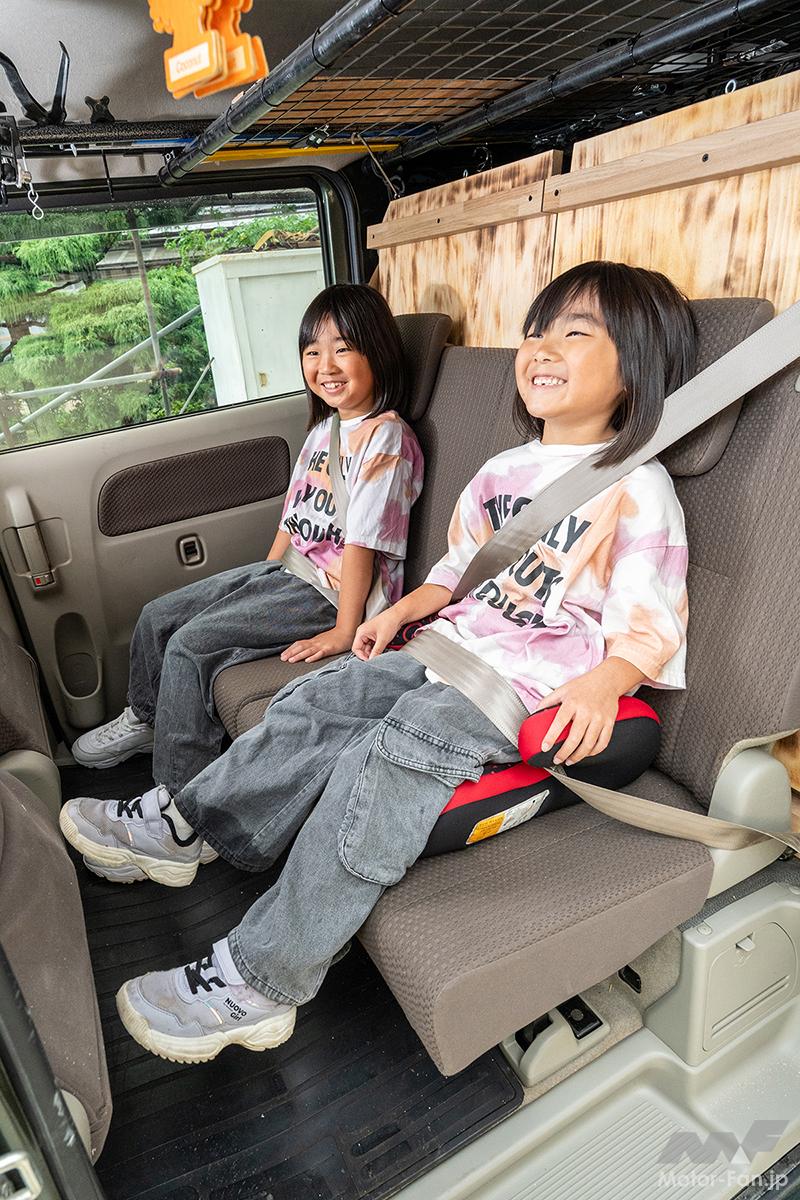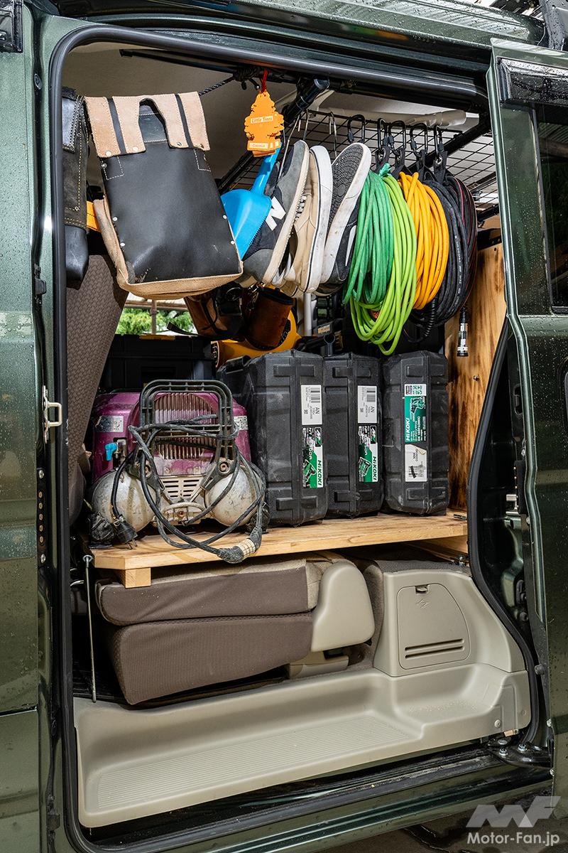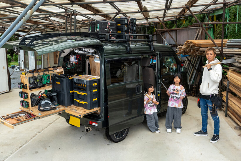 カスタム 「私たちのシートもちゃんとあります」パパの愛車『エブリイ』は、仕事と遊びの二刀流!【写真・9枚目】 クルマの荷室は完全なスクエア形状ではないため、緻密に計算して組み上げてもある程度のすき間は発生してしまうもの。ソコを有効活用すべく追加のスライドレールも導入している。 SUZUKI エブリイ(DA17)荷室カスタムにいそしむ派はエクステリアに無頓着な人も多い中、渡部さんはチョイアゲ車高にバンパーカット+ブッシュガードバー装着などしっかり手を掛けているのだ。 スライドレールを駆使したDIYメイクは作り手によって千差万別ありそうだけど、レール幅ギリギリで引き出しを製作しちゃうのはさすが。 これまたスライドレールを用いた引き出しの中には、好きが高じて握り手から手彫りしたという金槌がズラリ。たしかに味のある風格が出てます。 リアゲートの開口部より上のスペースはスライドさせられないため、視認性の高い格子状のラックを作って薄手のモノを収納している。 スライドボードを引き出すと脱着可能なフタからバッテリーにアクセスすることが可能。ノギスなどの薄っぺらい工具も収納されている。 ストレージシステムはDeWALTのTSTAKシリーズで、形状やサイズが異なってもカチッと固定できるので荷崩れも心配なし。 本来は家屋の扉などで使用する錠前を利用してTSTAKのロックシステムを再現。スライドボードそのものにガッシリ固定できる。 よくよく細部までチェックしてみると家具として使用される取っ手や引き手がそこかしこに見て取れる。さすが大工さんの見識だ。 跳ね上げたボードは天井に吊した格子ラックに固定して後方の荷物が飛び出すのを防ぐ。 OWNER 渡部 孝介さん 渡部さんと撮影に参加してくれたのは、ちょっぴり緊張気味だったなつめちゃん(7歳)とあやめちゃん(6歳)。お母さんが用意してくれたペアルックがめちゃくちゃ似合ってましたよー♡ この画像の記事を読む