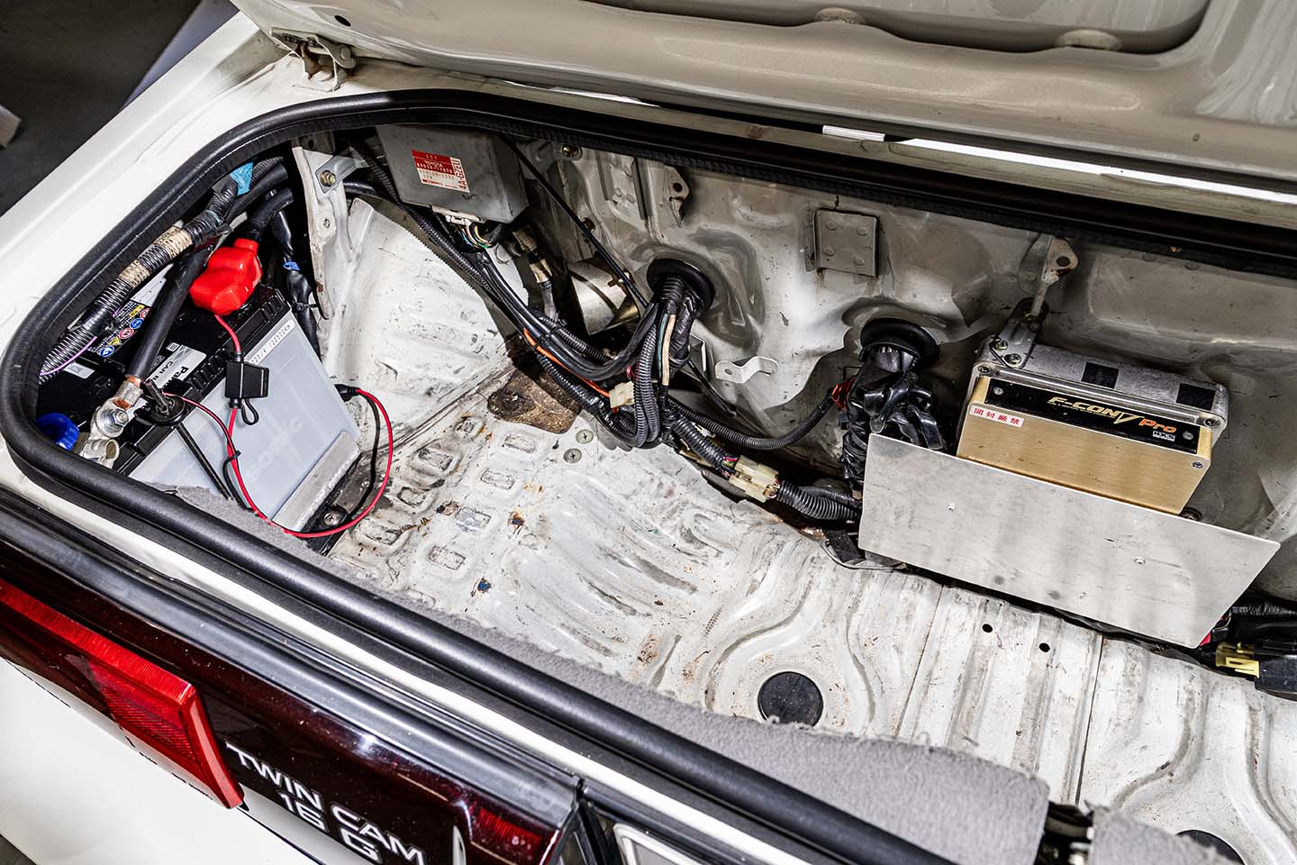 エンジンを制御するF-CON Vプロはトランクルーム中央に設置。奥にはエンジンルームから移設されたバッテリーも確認できる。