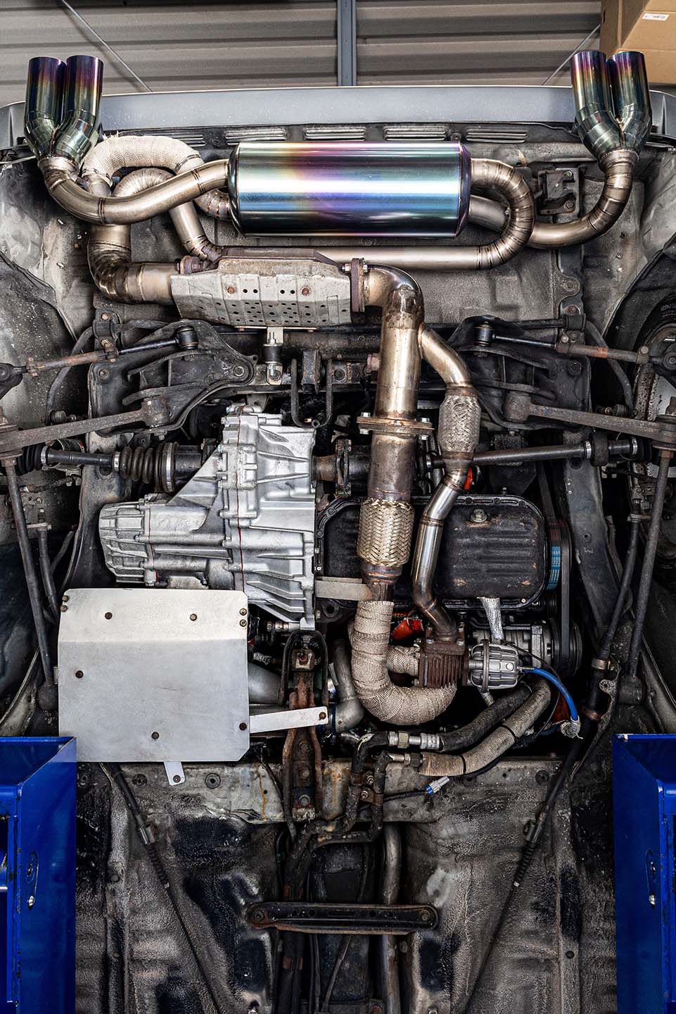 シャシー後方の下回り。排気系の取り回しがよく分かる。写真では見えないが、タービンはオイルパン前方の中央寄りに配置。ウエストゲートからの排気は触媒の手前でセンターパイプに戻される。マフラーはチタン製のワンオフ品。メインパイプ径70φ、左右デュアル出しのテールエンド径は50φの設定だ。また、ミッションはAE111純正C160型6速MTが搭載される。