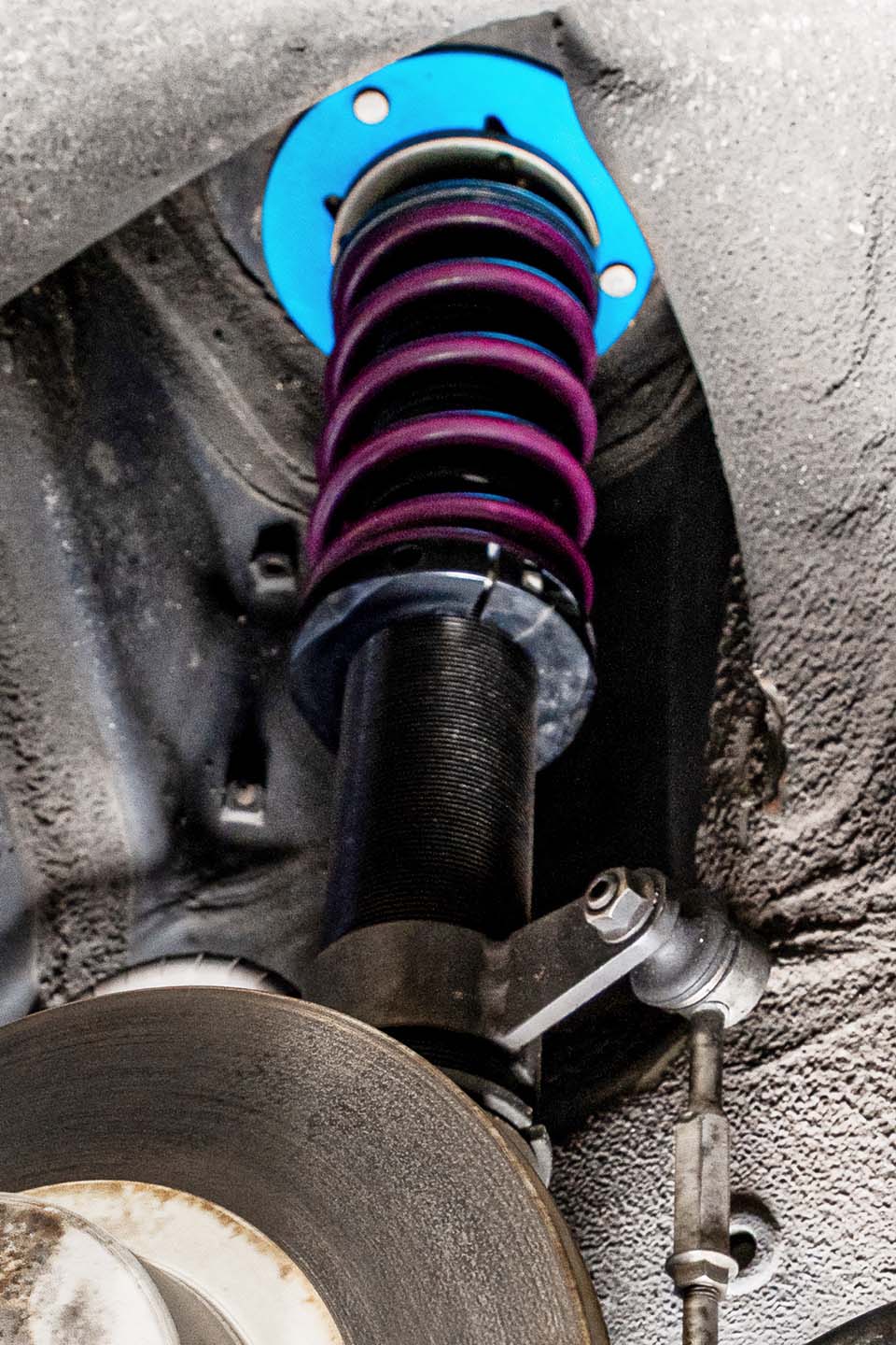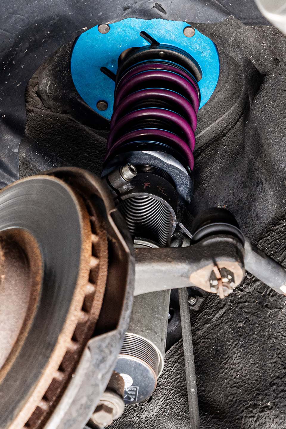 車高調はアラゴスタ製のワンオフ品を装着。AW11はリヤサスペンションもストラット式のため、調整式アッパーマウントが採用され、キャンバーセッティングを可能としている。また、ブレーキはキャリパー、ローター共にノーマル。パッドのみエンドレスMX72プラスに交換される。