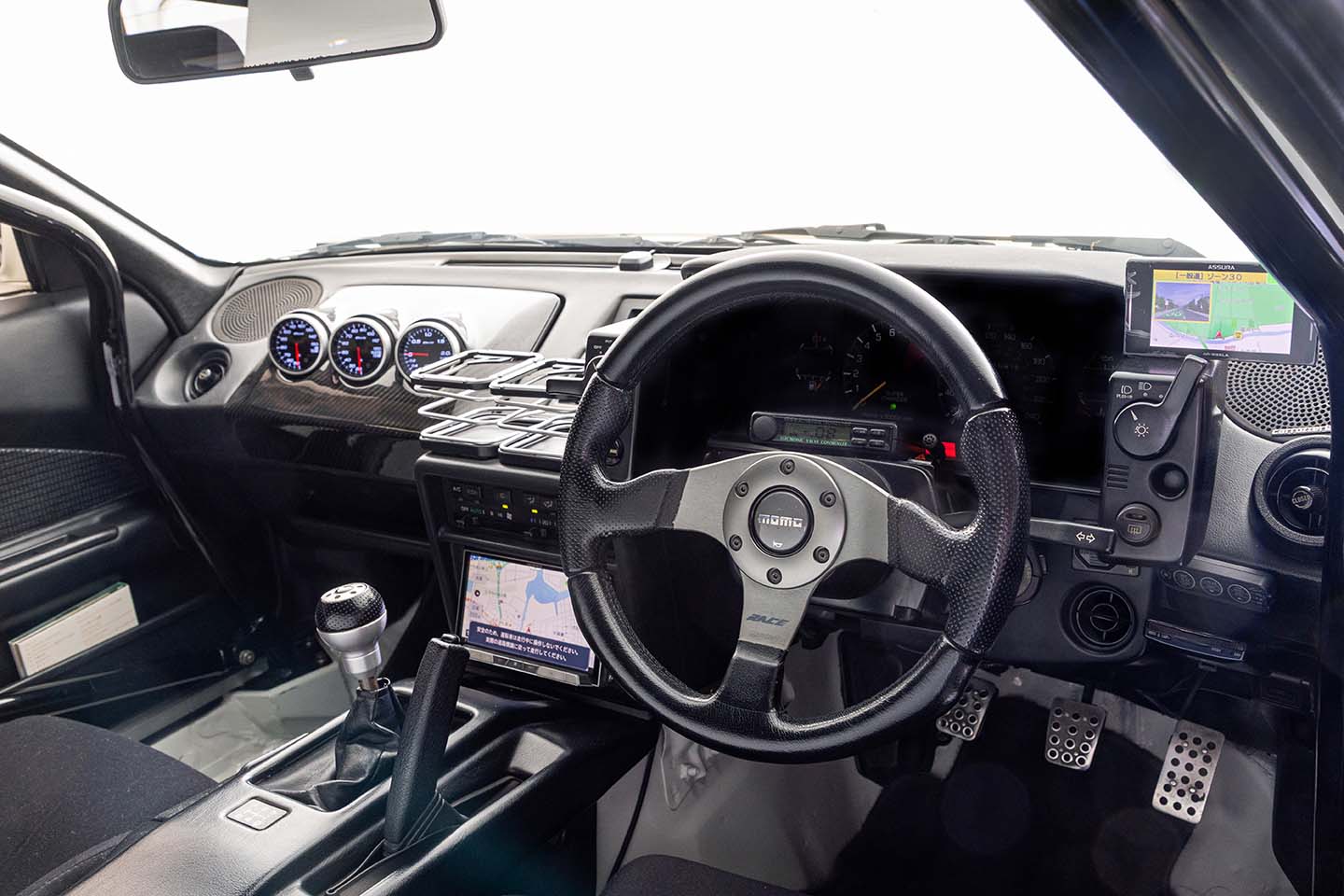 ステアリングホイールはモモレースに交換。ステアリングコラム上にはHKS EVCIIIが確認できる。助手席の目の前に並ぶのはデフィブースト/水温/油温計。メーターパネルはワンオフ。
