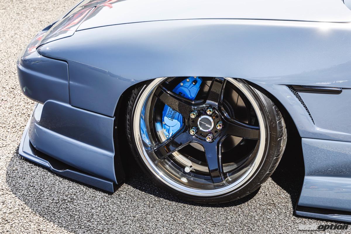 フロントフェンダーはスピリット玲の片側40mmワイドをベースとし、ワイド感を求めて前側のみ30mm程度の拡幅加工を実施。リヤフェンダーに合わせてデザインしたというアーチのラインが非常に美しく、車高を下げた状態でハンドルを切ることのないエアサス仕様だからこそ成立するクリアランスだ。
