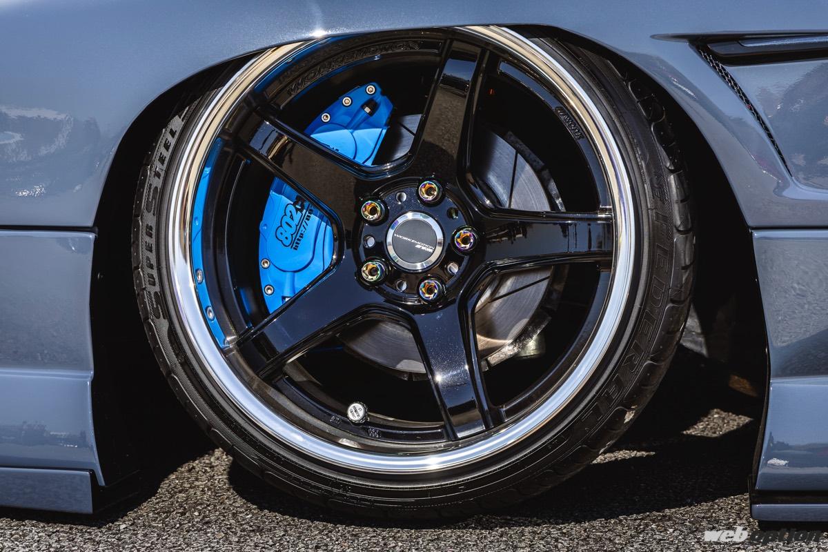 ブレーキはフロントのみBNR32純正を流用し、802カスタムのキャリパーカバーでドレスアップ。アーム類はリヤ3点のみスキッドレーシング製に交換している。