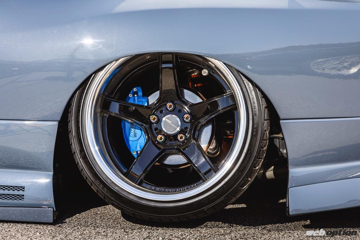 ホイールはワークエモーションT5R 2Pで、フロントに10J×18-7、リヤは12J×18-32という極太サイズ。スペーサーはフロント20mm、リヤ6mmだ。タイヤは「街乗りがメインなので安さとショルダーの形状重視」とフロントにフェデラルSS595(225/40-18)、リヤにトライアングルTR968(265/35-18)を履く。