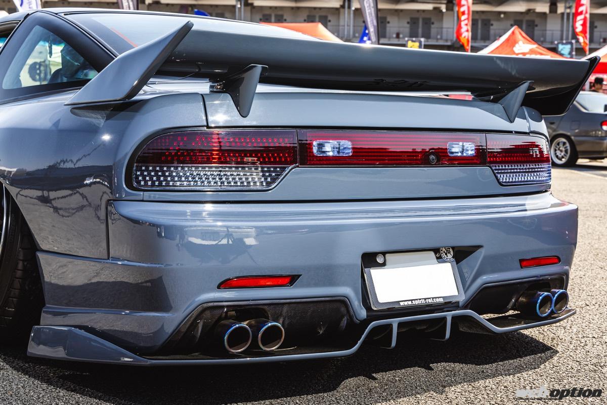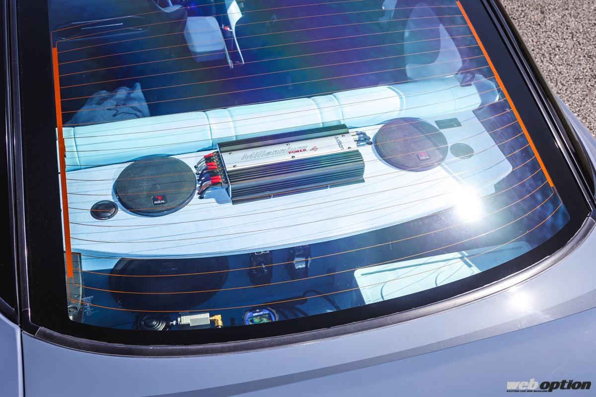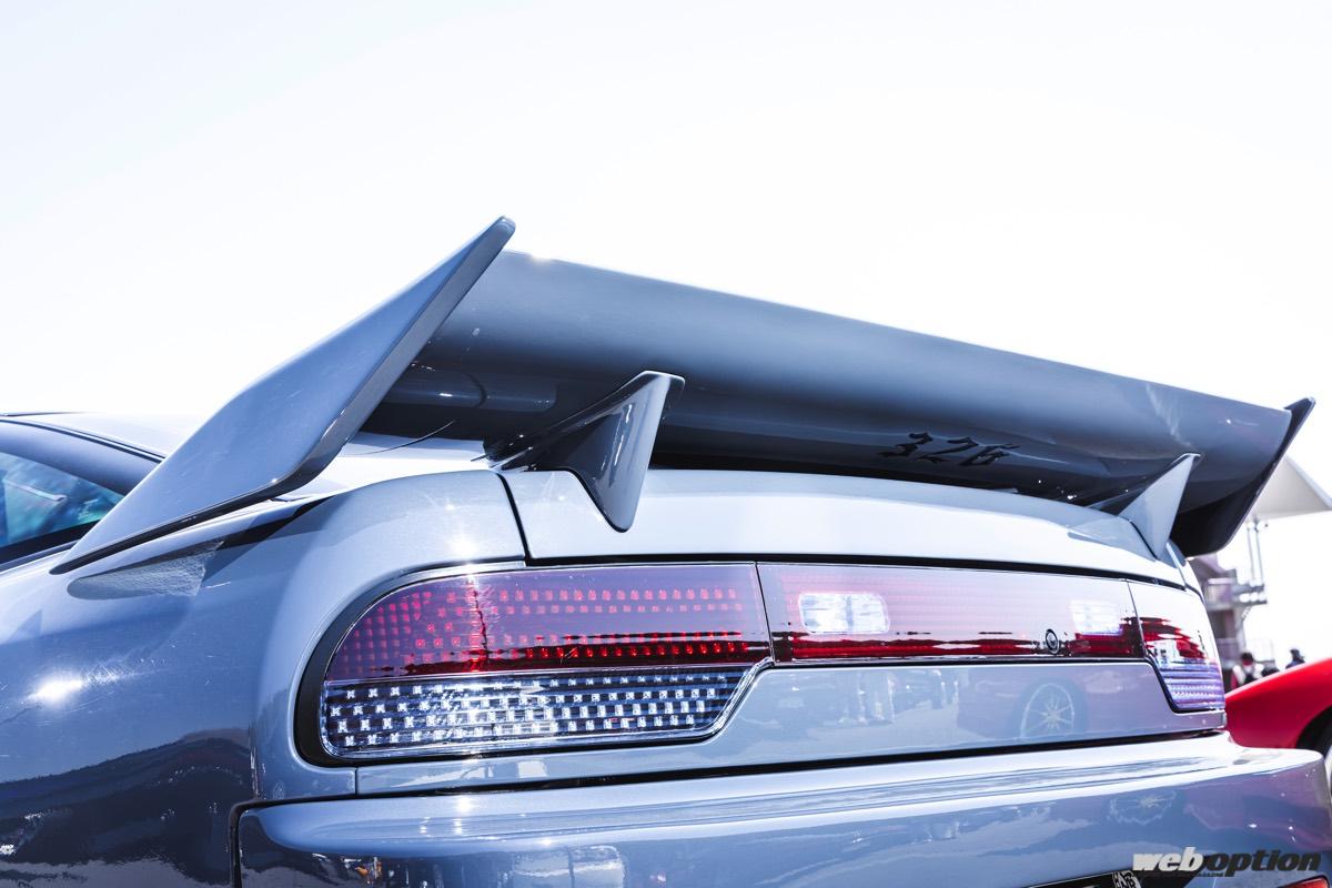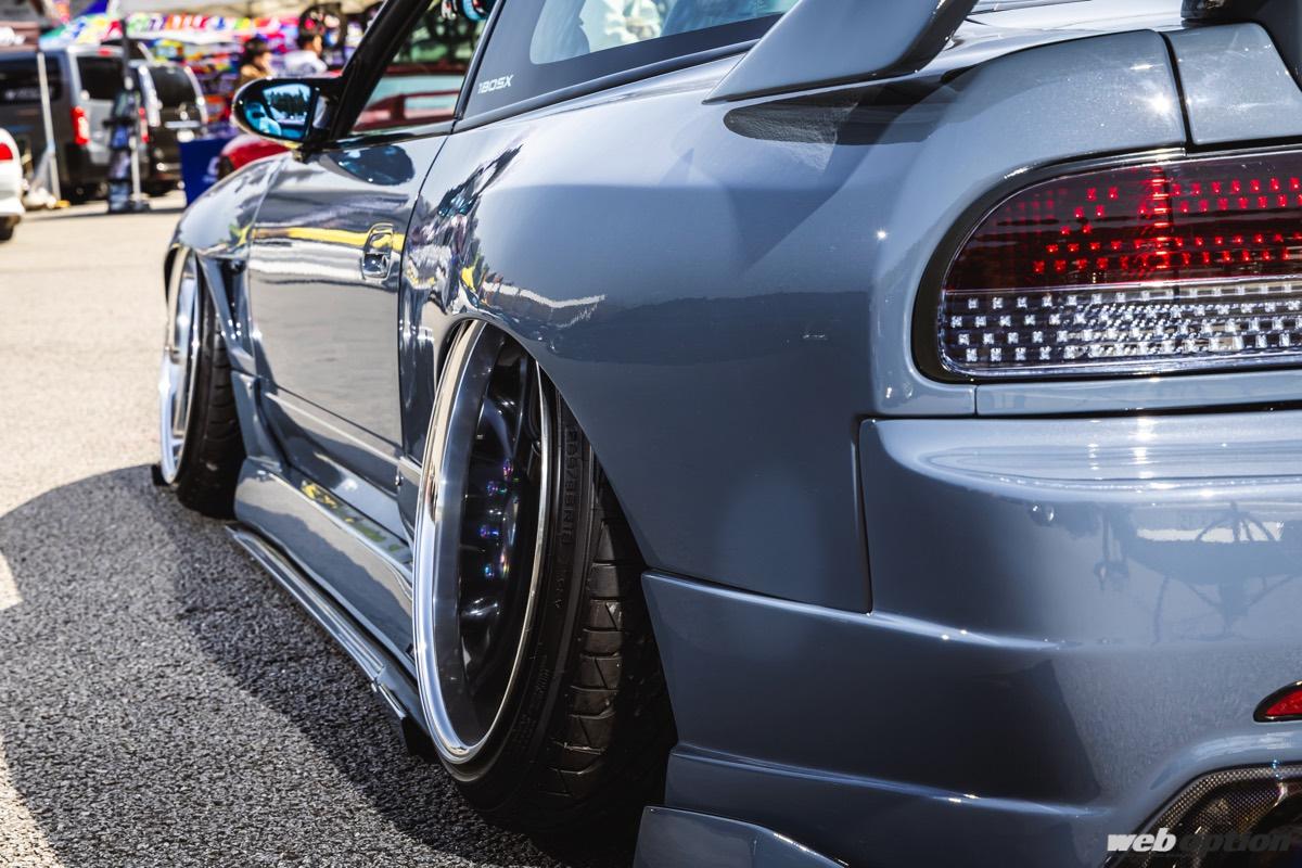 ウイングは326パワーの可変満力ウイングプラスだが、翼端板の可変部分をスムージング処理した上、ウイングステーも「エアサスで下げた時に、ウイングの位置が高いとハイトがあるように見えてしまう」との理由から、ウエスがギリギリ通せるレベルまで短縮加工している。なお、LEDテール&ガーニッシュはネットで購入したメーカー不明品とのこと。