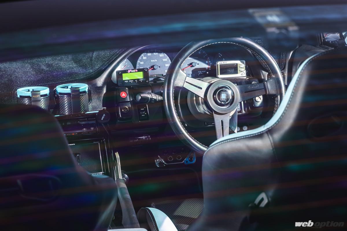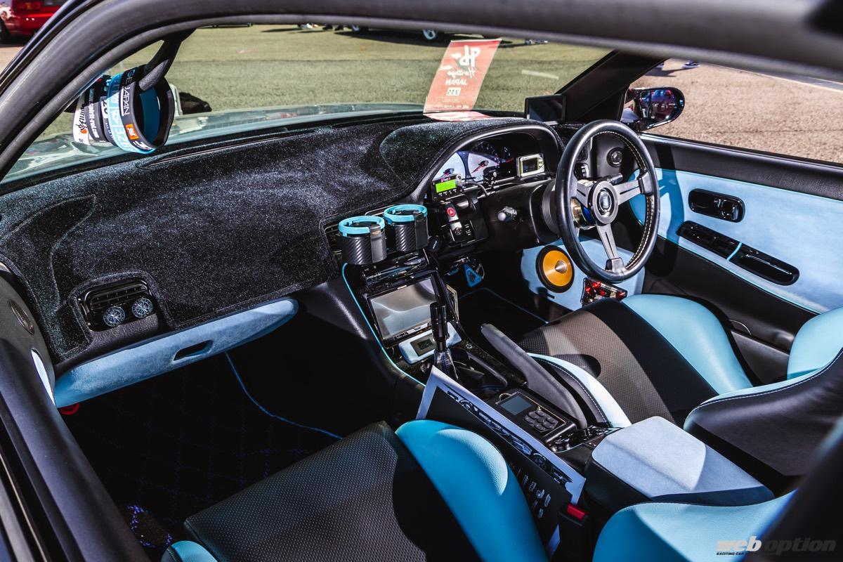 インテリアはブルー×ブラックでコーディネイト。左右シートは業者に張り替えてもらったそうだが、その他の部分はカスタムオーディオまで含めて全てオーナーが施工した。