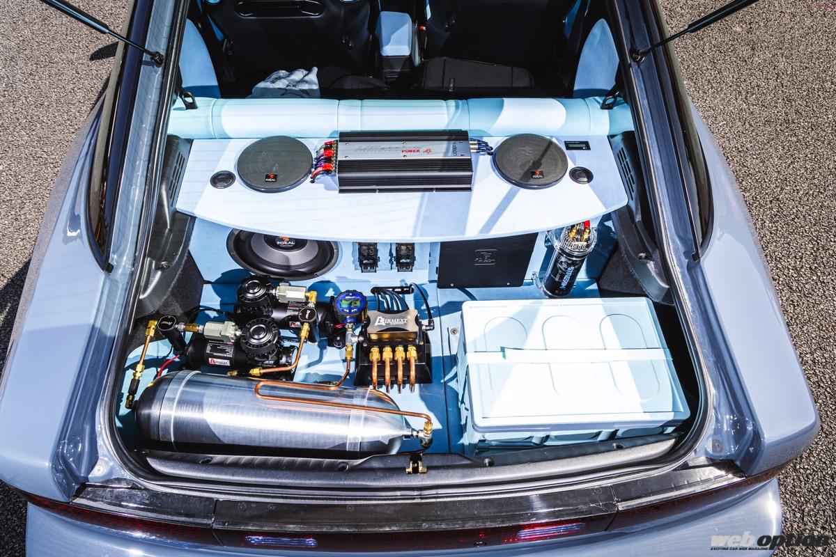 エアサスのシステムやオーディオのウーファー類はリヤハッチ内に美しくマウント。右側のボックスは工具入れだ。