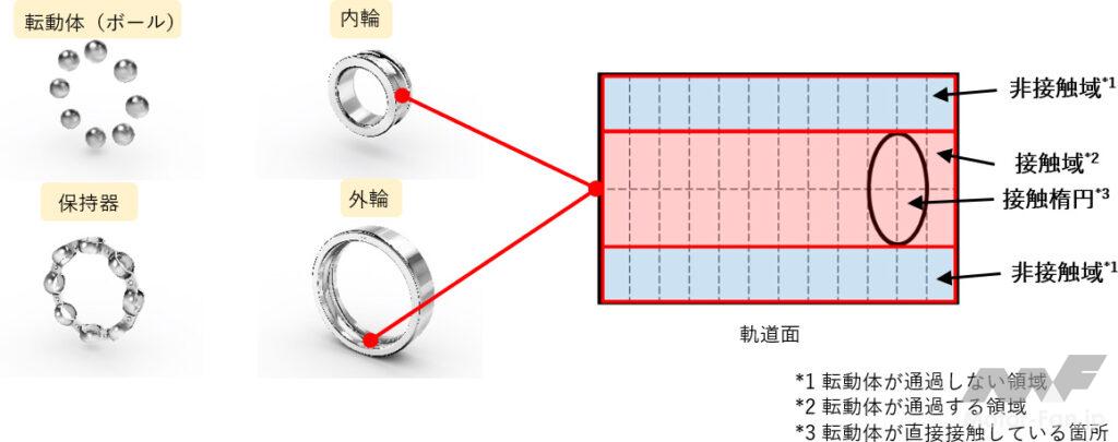 新たに開発したトルク計算手法は、軸受のボールが通過する軌道面に着目し、ボールと軌道面の接触域と非接触域を分離して計算するものである。従来は接触域のみが計算対象とされていたが、新たに非接触域も計算対象とすることで、トルクを発生させる要因をより細かく計算でき、各要因がトルク増加につながるメカニズムを明らかにすることに成功。本手法により高速回転条件におけるトルク計算の精度を従来比で最大50%向上させることに成功した。本手法を幅広い条件下で用いることができる計算式を作成し、社内の計算プログラムへの適用が完了されている。