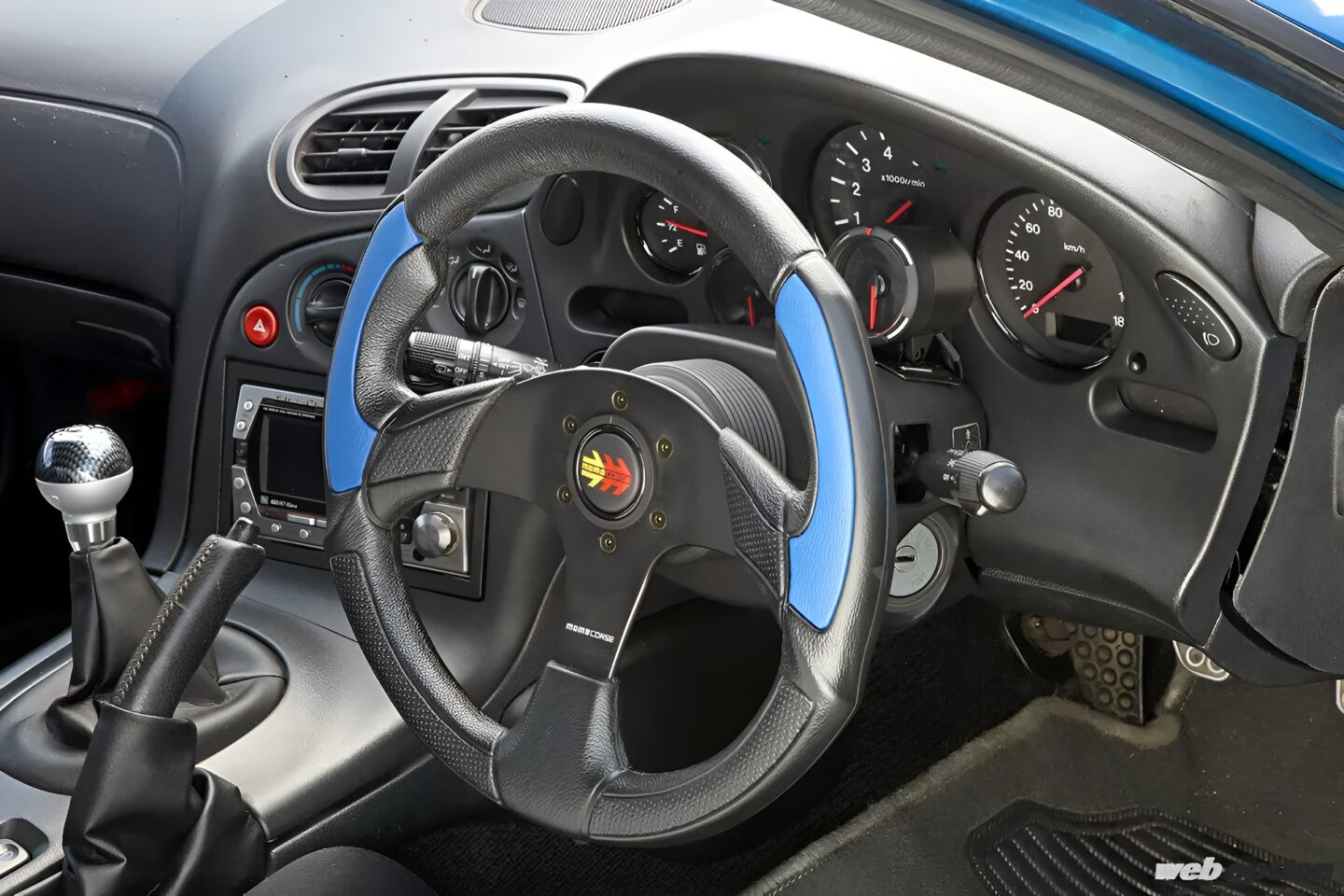 メーターはタコメーターのパルスを変更し、1JZ-GTEエンジンに対応。FD3S純正メーターがそのまま使われていることもあり、エンジン換装というハードメイクが行われていることを全く感じさせない。