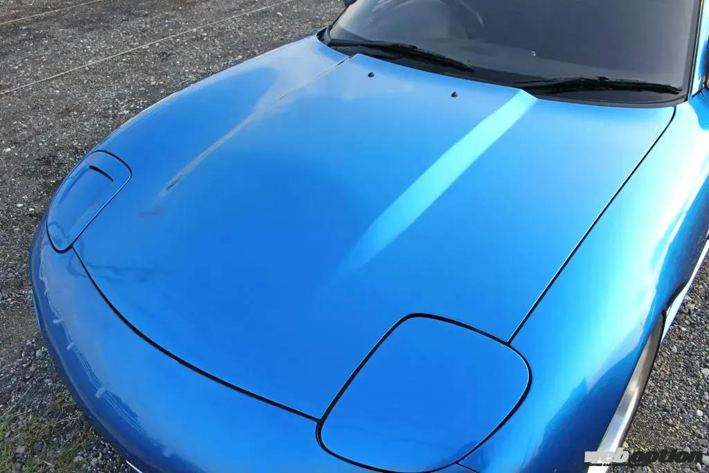 エンジン換装の苦労話は尽きないが、ボンネットの高さに納めることもその一つ。1JZ-GTEのエンジン高対策として、タービン周辺のパイプ類をワンオフ製作した上で、ボンネットにはFD3Sのボディラインを崩さないパワーバルジを設けている。ちなみに、リトラクタブルヘッドライトは問題なく機能する。
