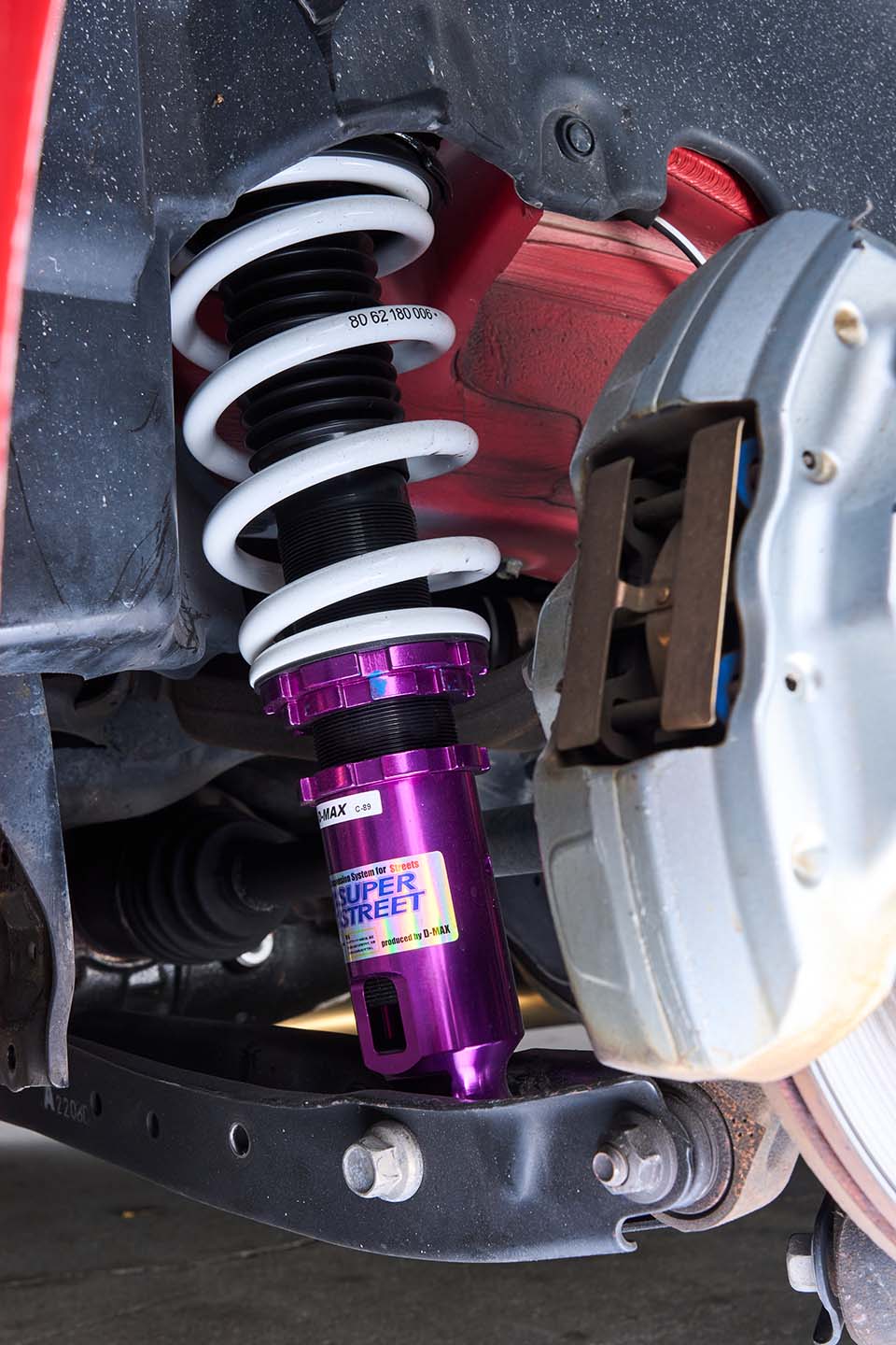 足回りは、阪口良平選手監修によるD-MAXとのコラボ車高調を採用予定。近日中のドリコン参戦に向け、フロントにはナックルやタイロッドの交換も行われている。