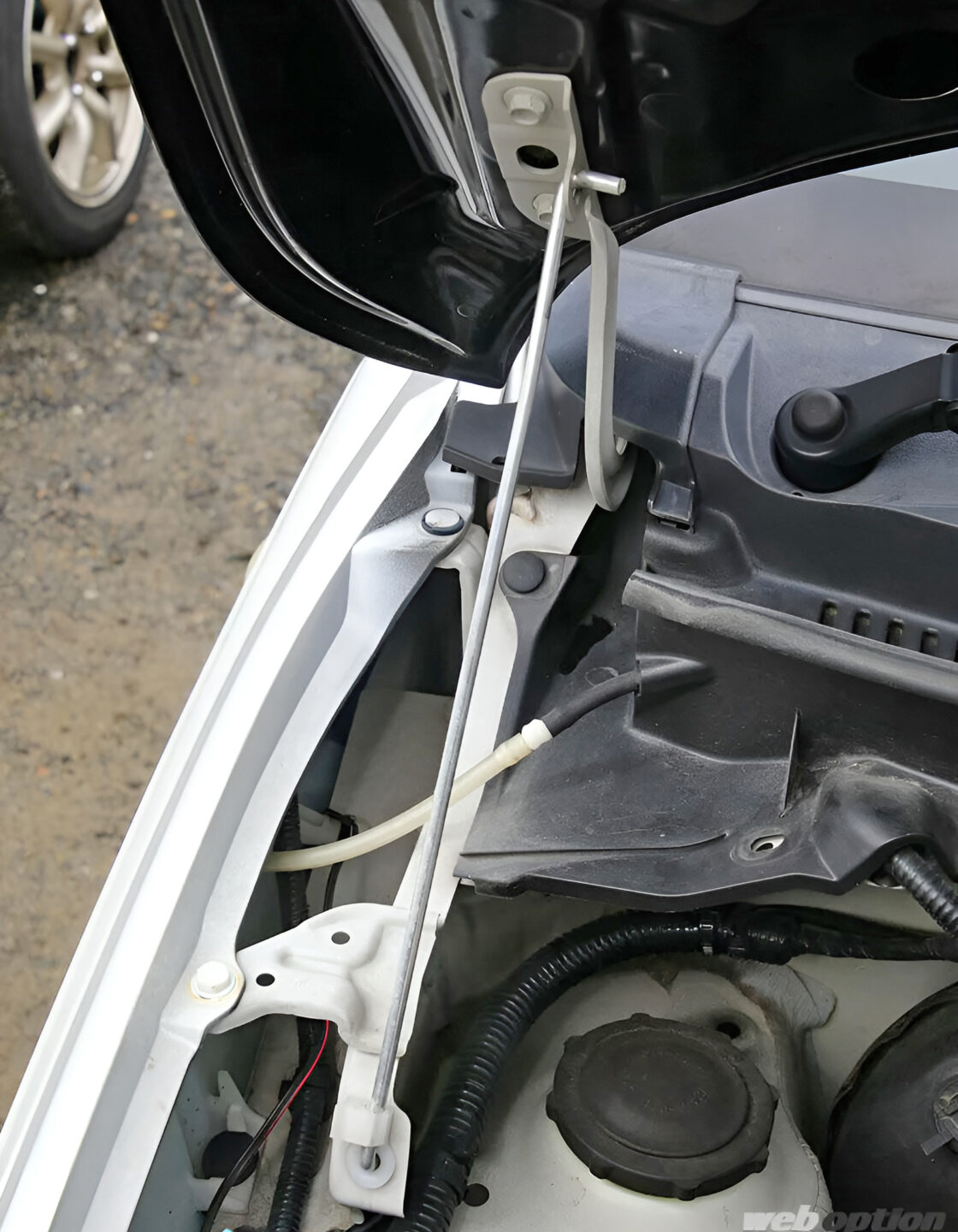 ボンネットロッドはアルミでワンオフ、さらに各部のボルトやナットは樹脂やチタンに変更することで、グラム単位の軽量化を積み重ねている。