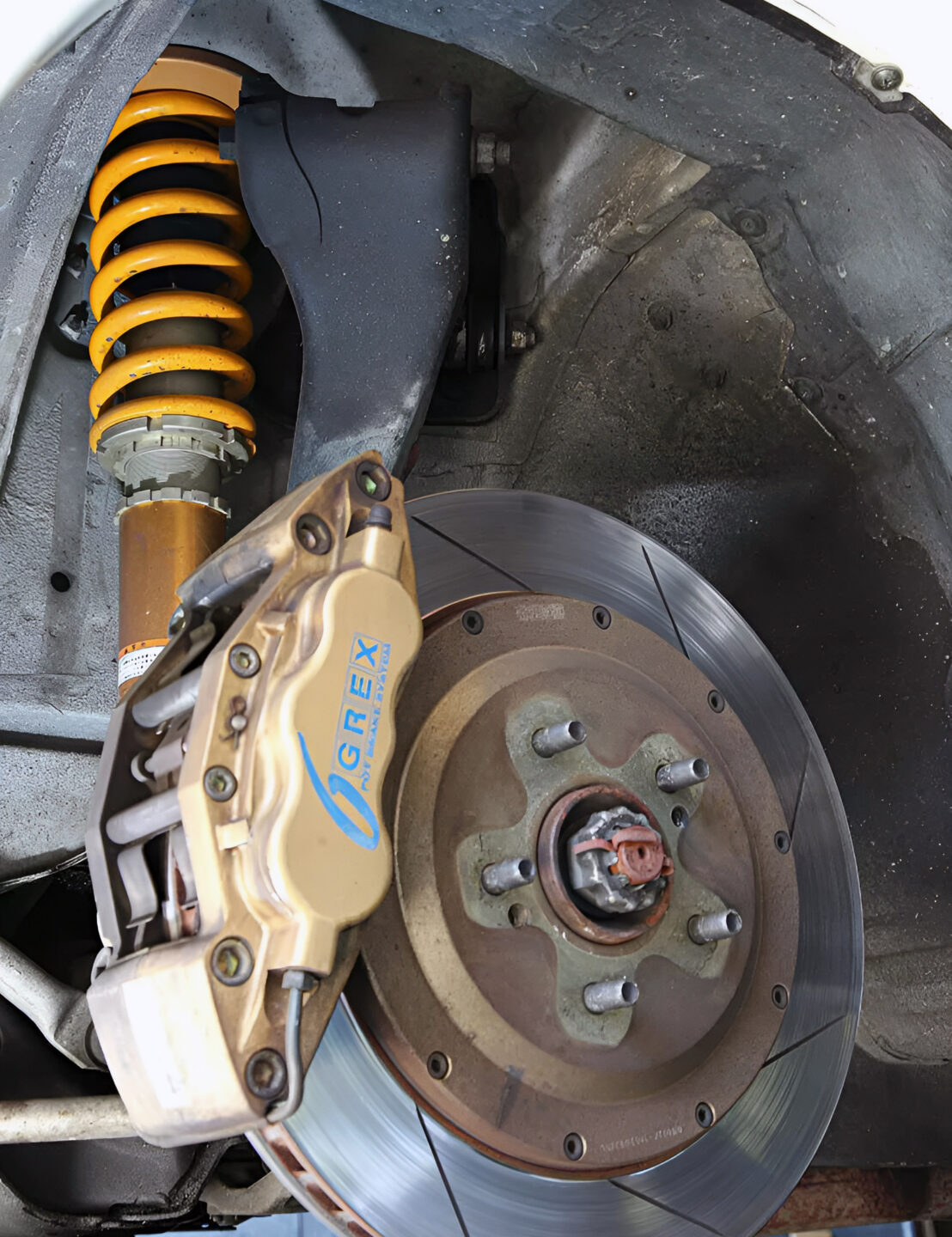 足回りはオーリンズ車高調を軸に、ニスモ製アームがフルで装着される。ブレーキはトラスト製GREXフロント6ポット、リヤ4ポットキャリパーキットで強化。