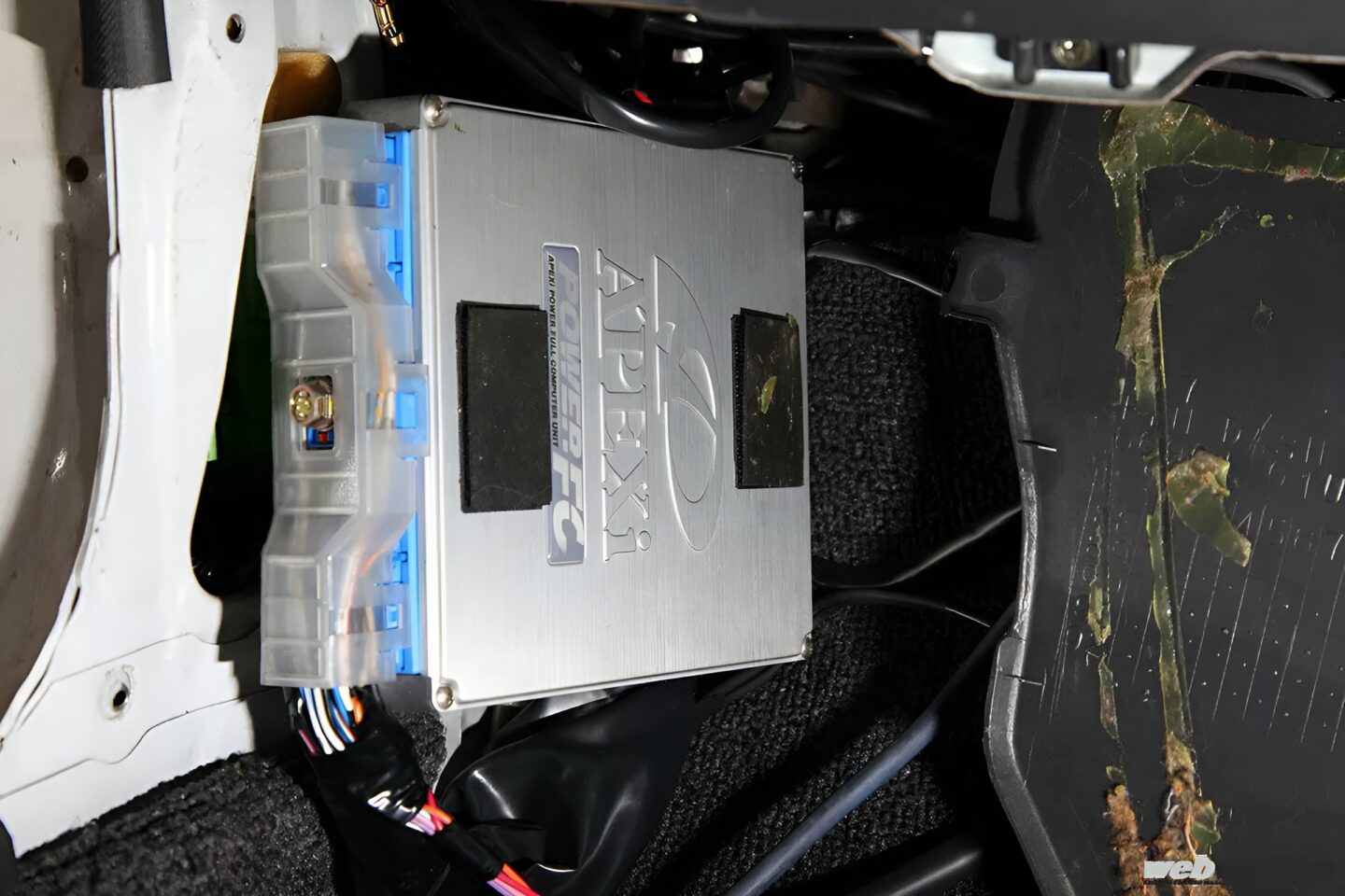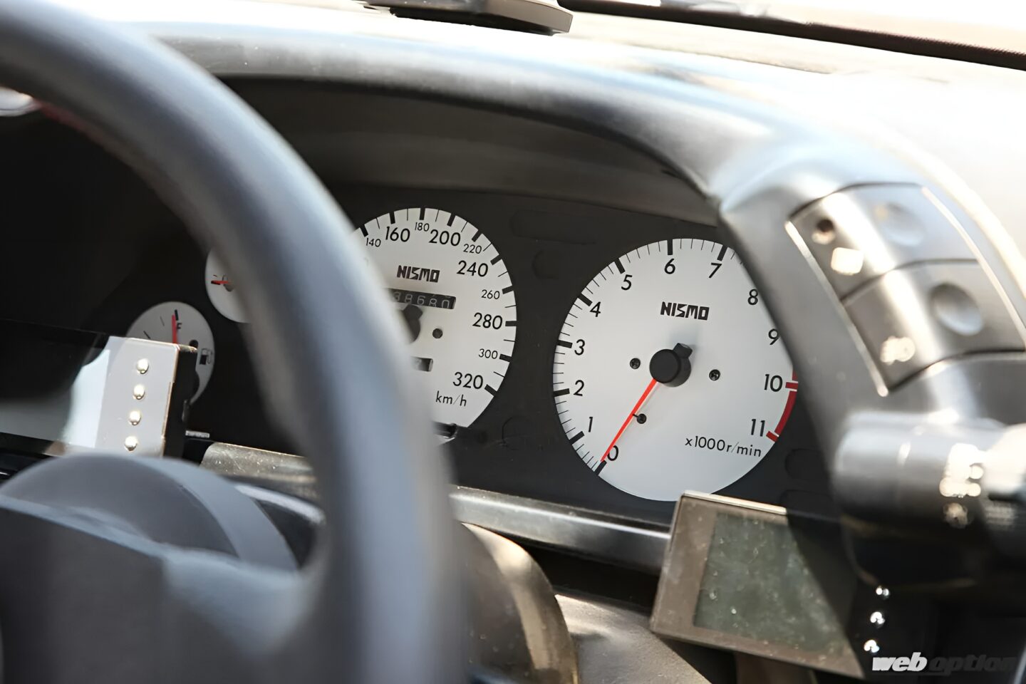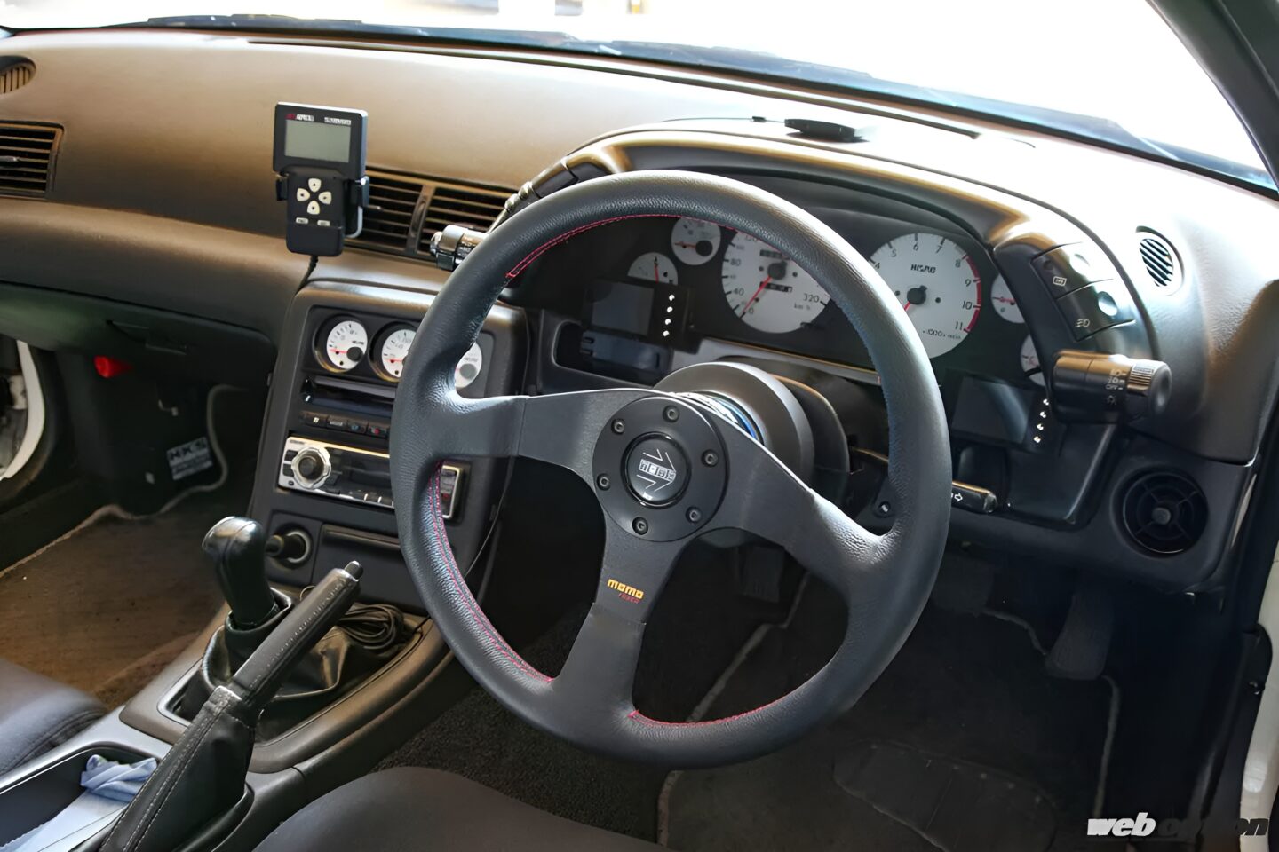 メインメーターはニスモ製に交換。スピードメーターは320km/h、タコメーターは1万1000rpmフルスケールとなる。ステアリングホイールはモモチューナーに交換されるが、シートは運転席、助手席共に純正のままとされる。「FCコマンダーも用意してますけど、セッティングのためではなく水温管理用の追加メーターとして使ってます」とアートテック花塚代表の花塚さん。