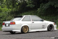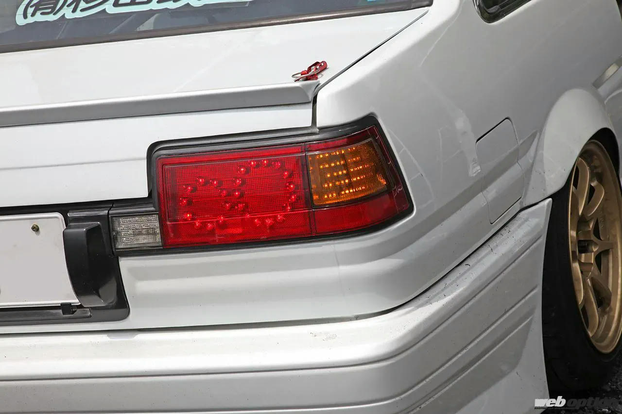なお、エンジン換装にあたっては3S-Gはエンジン高があるため、逃げの大きいランフリー製ボンネットを導入して対応。ワンオフエアロに叩き出しフェンダーでエクステリアもドレスアップ済みだ。ヘッドライトやテールランプはオーナー自らLED加工している。