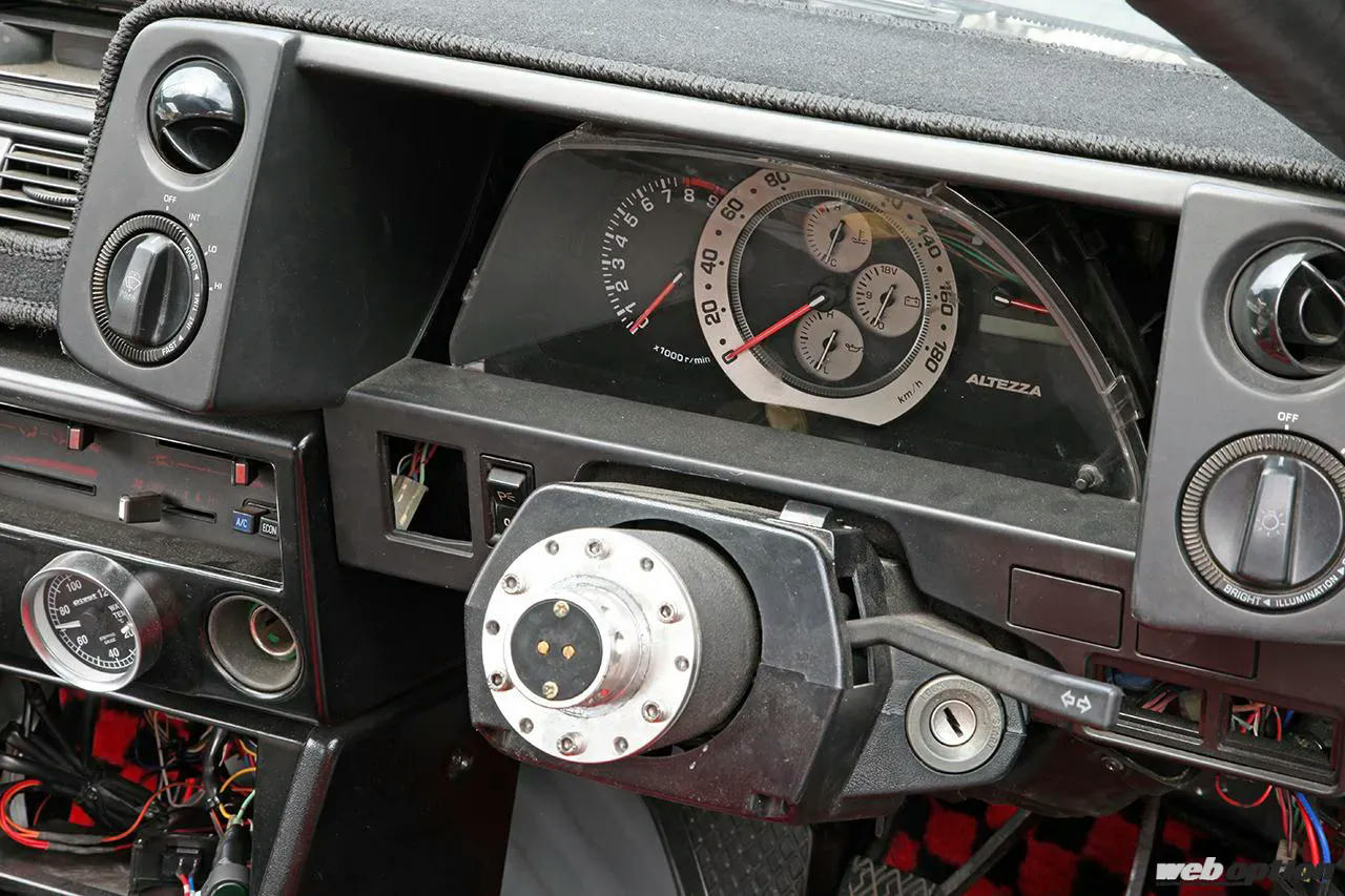 メインメーターはアルテッツァ純正をビルトイン。ECUごと移設しているため、燃料計も問題なく機能するので車検の心配もなしだ。