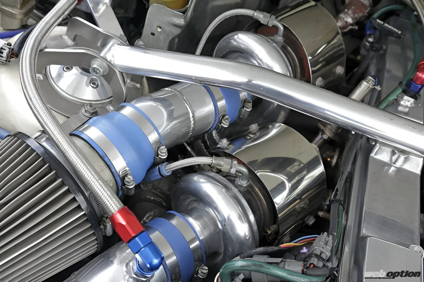 新たにチョイスしたタービンはTD05のツインだ。その気になれば600psも狙えるスペックだが、普段は500ps(ブースト1.3キロ)まで抑えて負担を低減。それでもピークパワーを落とした分は、しっかりとレスポンス側に振ることで、他車との加速バトルでも不足の無い戦闘力を確保している。
