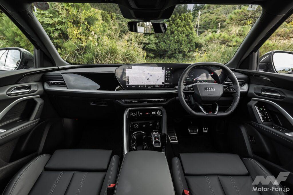 インテリアはA5と基本的には共通で、11.9インチサイズのアウディバーチャルコクピットと14.5インチのMMIタッチディスプレイの組み合わせ。2つのディスプレイが湾曲したバイザーレスのクラスターに収まっており、ドライバー側に傾いた状態で設置されている。スタティックな状態でも多分に先進的だが、光の演出面でも先進さを感じさせるのが新型Q5のポイント。ハザードランプを点けるとフロントガラス下端両サイドが光る仕掛け。ダイナミックインタラクションライトと呼ぶ機能で、ドアのロック/アンロック時やウインカー作動時にも反応する。