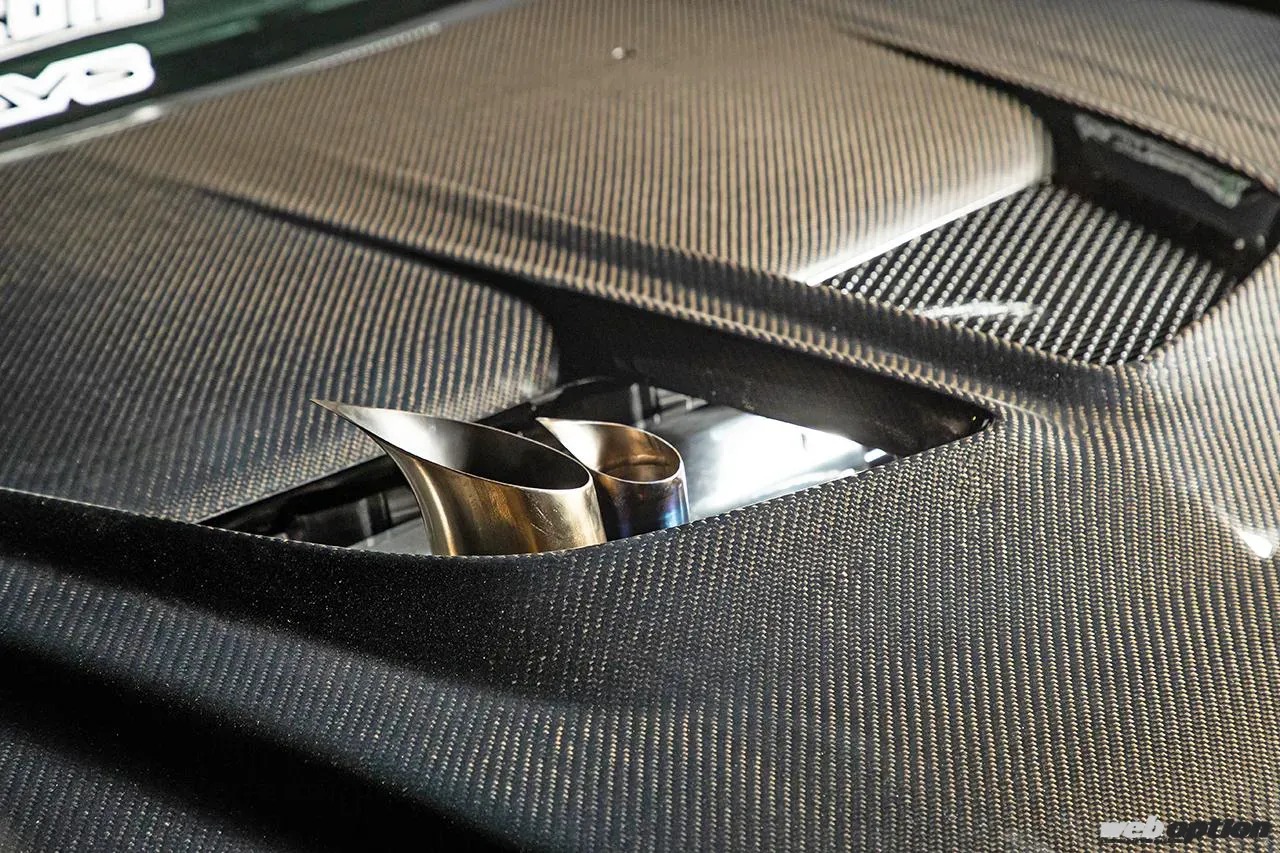 タービンは、Gonzevoのキットを使用して1000ps対応のXona 9569をトップマウント。カーボンボンネットから突き出るチタン製アップパイプが攻撃的だ。