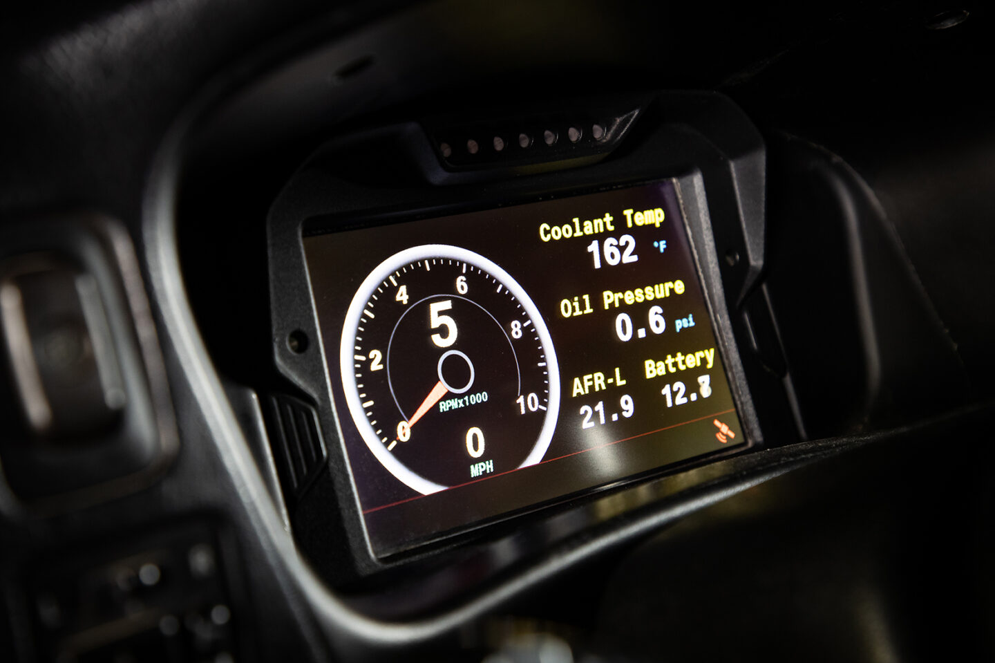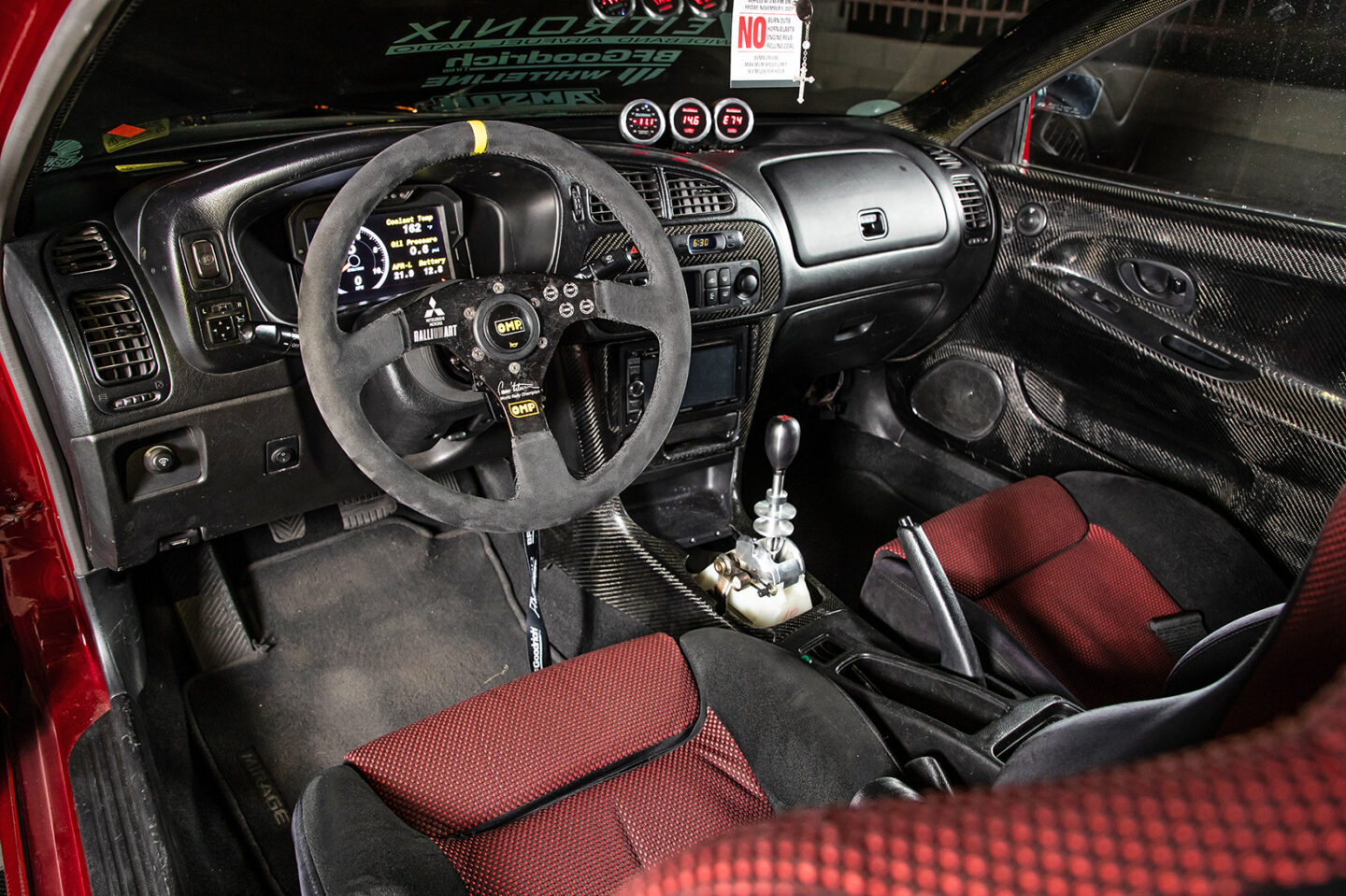 室内では、トミ・マキネンモデルのOMP製ステアリングとレカロシートがお気に入り。メーターはカーボンクラスターを備えるAEMのデジタルダッシュCD7Lだ。5速MTは、ランエボIVベースにランエボVIII/IX用のギヤを移植した強化版を組み込んでいる。