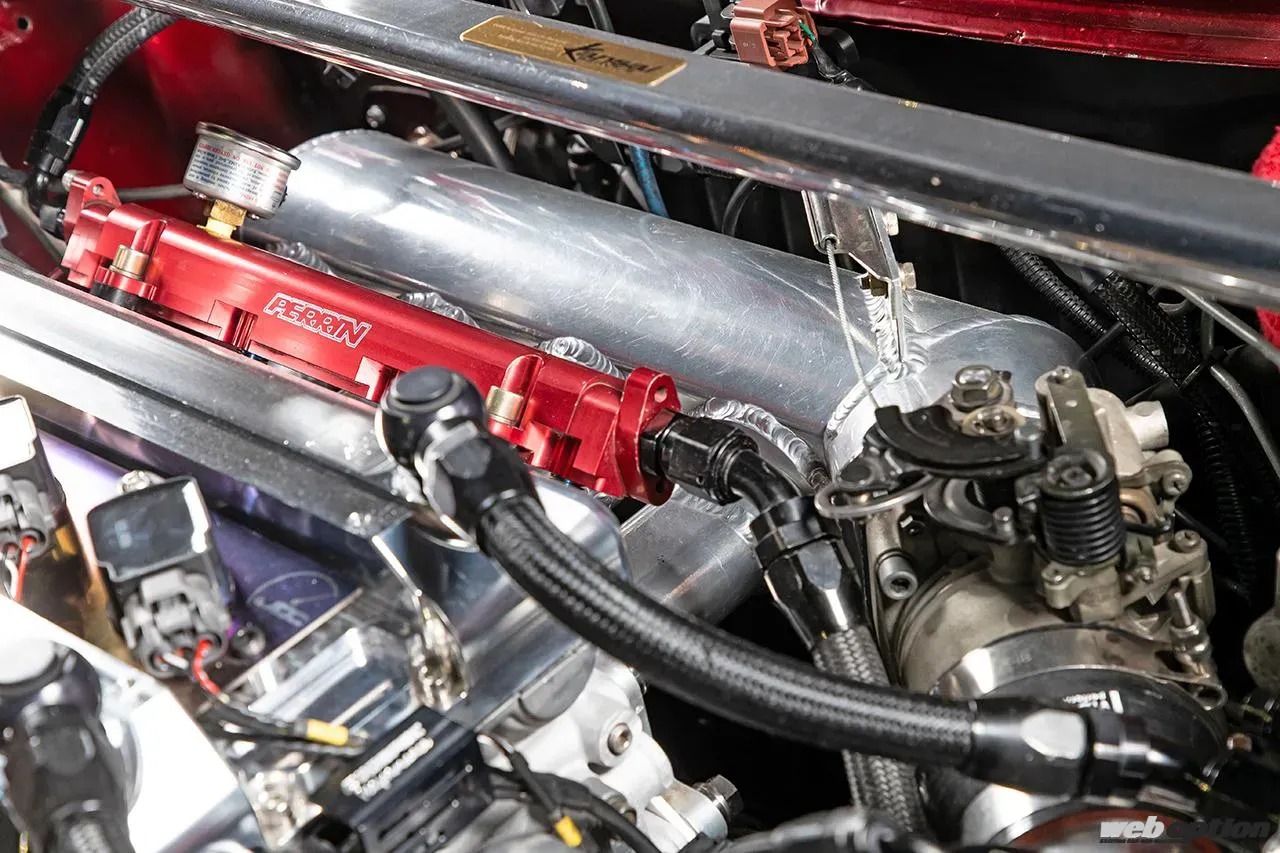 E85を使用する燃料系はID2600ccインジェクターで増量。点火系もR35GT-Rのイグニッションコイルで強化し、AEMのインフィニティ506で制御する。最高出力は753ps、最大トルクは80.6kgmに達している。