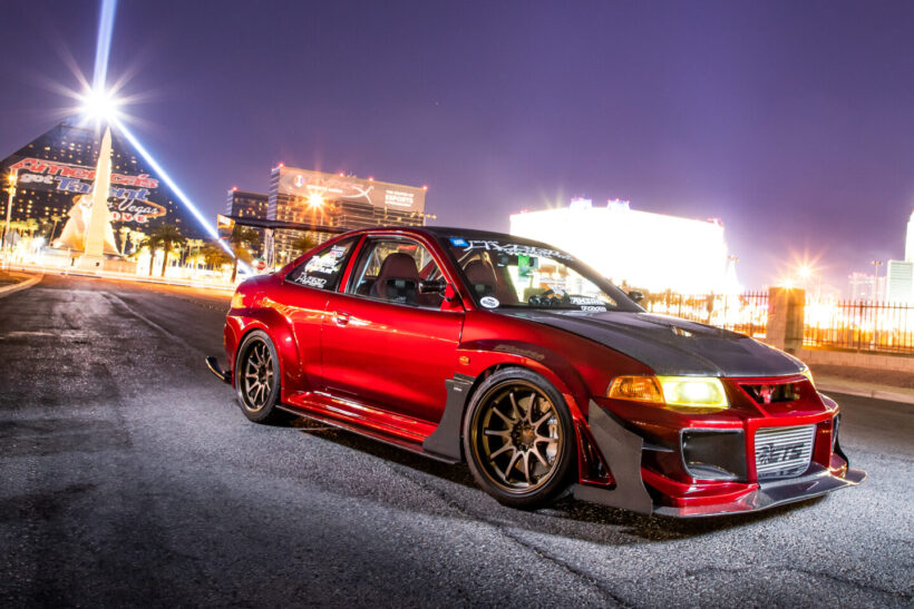 「ミラージュのパーツはドアとガラス、カーペットくらいかな(笑)」と言うほど、まさにWho am I?な大変貌を遂げた2ドアエボ。目標だったゼロヨンのタイムはストリートタイヤで10秒4、終速233.3km/hを達成し、アーチーの地元であるラスベガスで開催された2014年のSEMAでショーデビュー。はじめはクルマ好きではなかった男は、全米のカーガイ達から「Crazy!」と大賛辞を浴びたのであった。
