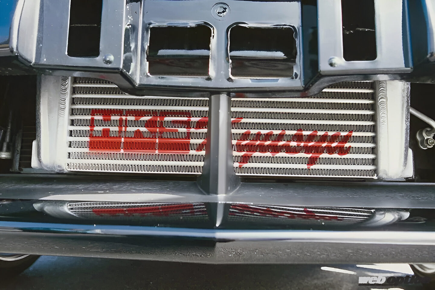 前置きインタークーラーは、EP82スターレットなどをターゲットに製作されたHKS製のものをオリジナルの50φパイピングで流用。フロントバンパーの開口部を占領するコアは迫力満点だ。