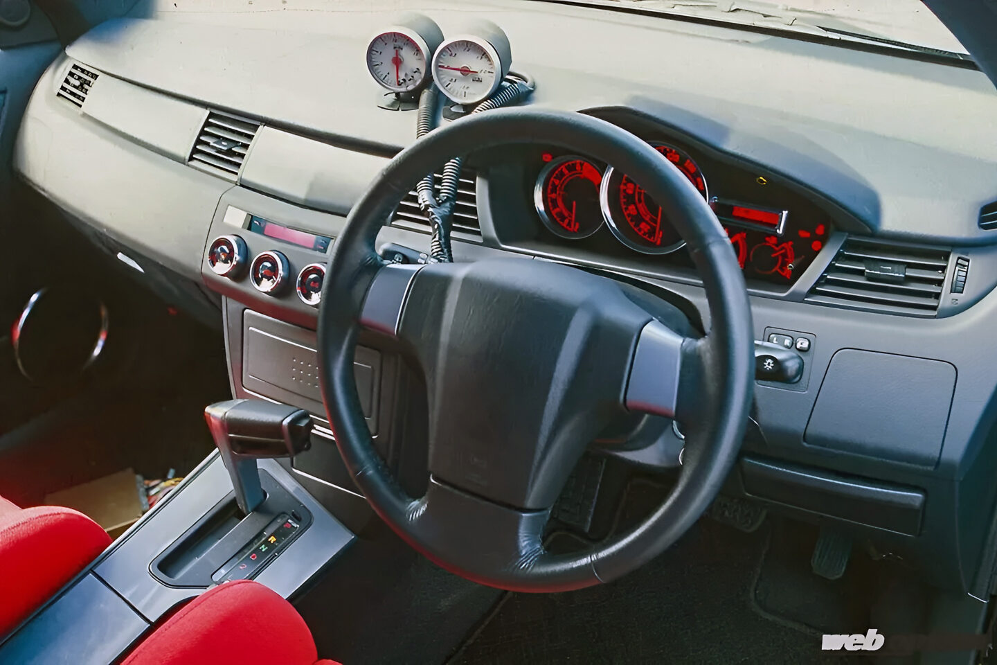 外装の特徴的なプレスラインと同様に、非常に存在感のあるデザインのインテリアを持つWiLL VS。ダッシュボード上にブーストと水温を監視するHKSの60φ追加メーターをセットしているものの、それ以外はノーマルを維持したシンプルな仕上がりだ。