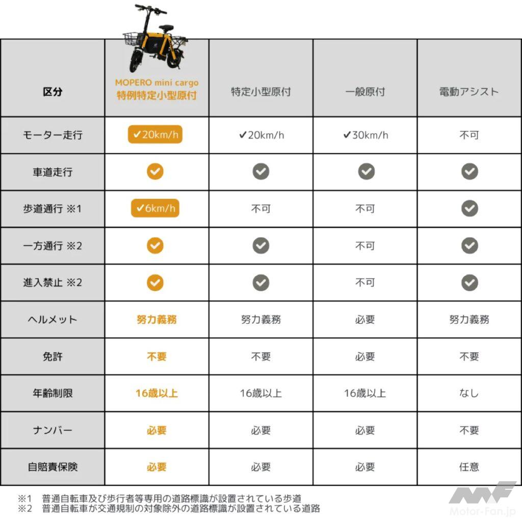 特定小型原付のため、バイク型ではあるが16歳以上であれば免許不要で運転可能であり、日常の移動手段としての利便性が高い。特に、大容量の積載性能と優れた登坂能力を備えており、国内での実用性を重視して設計されている。