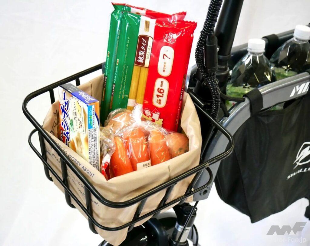 「MOPERO mini cargo」は、ペダルを持たず、モーターの力だけで走行するため、坂道や長距離移動でも疲労を感じにくい。前カゴ、中カゴ、そして自由に拡張可能なリアキャリアを標準装備しており、買い物や荷物の運搬に便利だ。