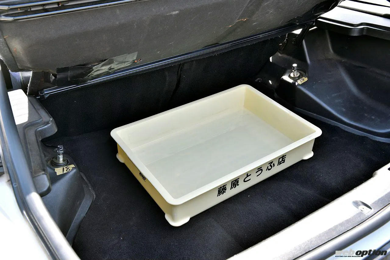 サーキット走行のための6点式ロールケージと運転席のレカロフルバケは、拓海のファーストステージ時を上回る装備。ラゲッジスペースには、原作に登場する豆腐ケースをイメージしたアイテムをセット。