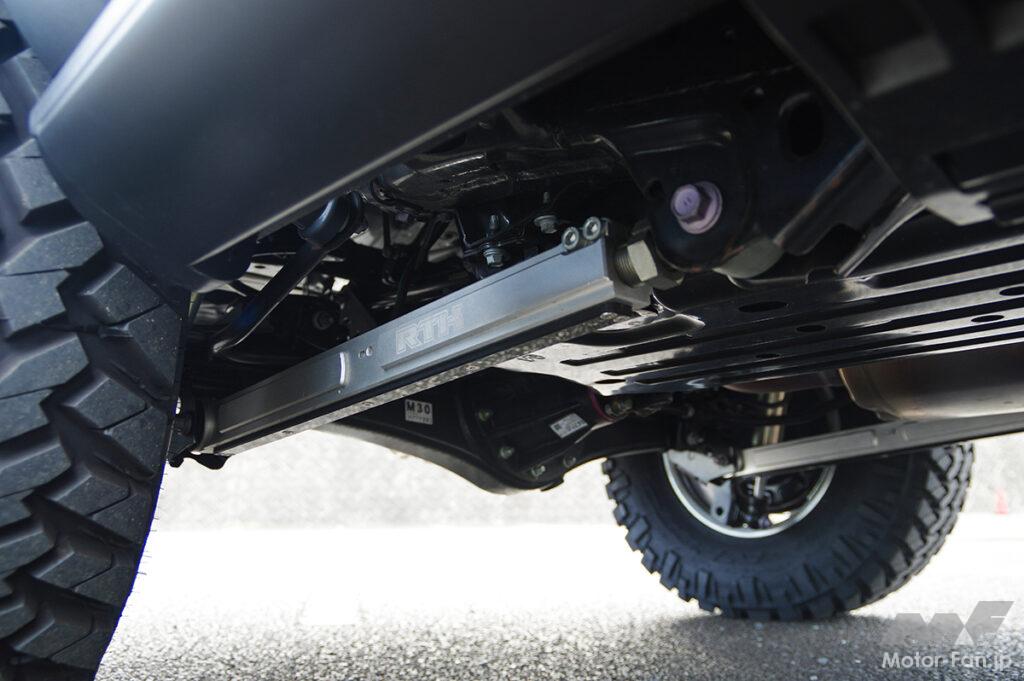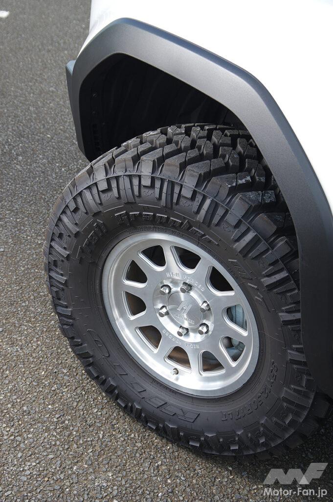 サスペンションには新鋭メーカーRTKの調整式コイルオーバーとアーム類を組み合わせ、リフト量だけでなく前後ストロークを適正化。ハイトを稼ぐことよりも「しなやかに動くこと」を優先したセットアップとなっている。そんな250に選ばれたタイヤはニットー・トレイルグラップラーM/T。深いブロックパターンと強靱なサイドウォールを備え、岩場や泥濘で高いトラクションと耐久性を発揮するマッドテレーン。だが、ただオフへ振り切ったわけではなく、内部構造とトレッド設計により、特に直進時のロードノイズを抑え込むことで、舗装路でも破綻しない走行フィールを獲得しているのが特徴だ。そこに組み合わせるホイールはハイフォージドトレイルシリーズHF10。クリーンで立体感ある10スポークが足元を引き締めトレイルグラップラーM/Tの逞しさと相互に補完し合う。