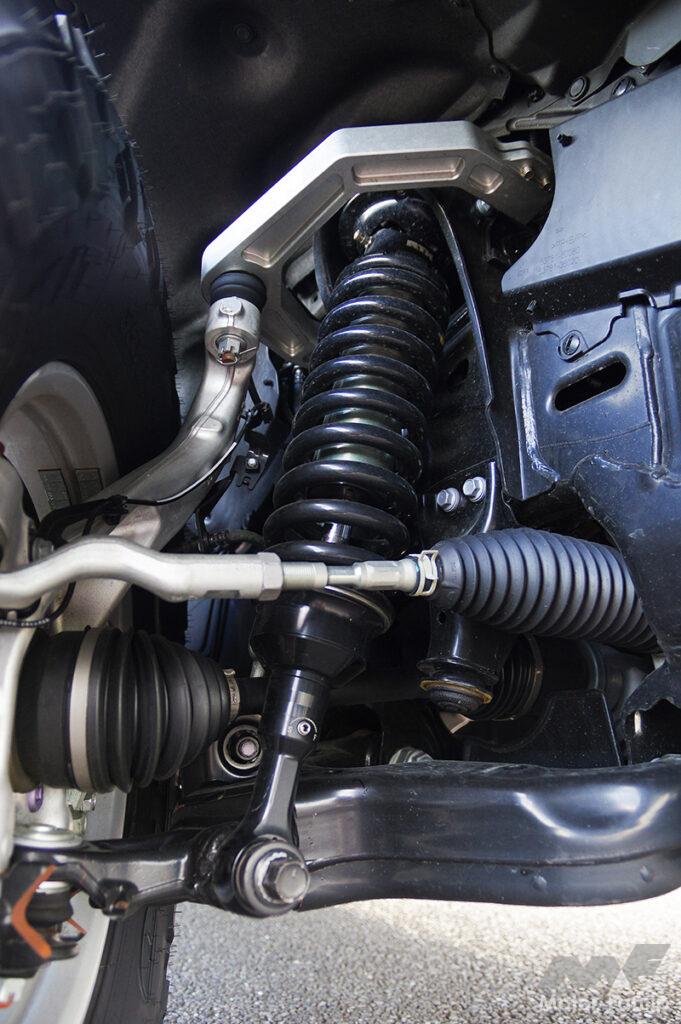 サスペンションには新鋭メーカーRTKの調整式コイルオーバーとアーム類を組み合わせ、リフト量だけでなく前後ストロークを適正化。ハイトを稼ぐことよりも「しなやかに動くこと」を優先したセットアップとなっている。そんな250に選ばれたタイヤはニットー・トレイルグラップラーM/T。深いブロックパターンと強靱なサイドウォールを備え、岩場や泥濘で高いトラクションと耐久性を発揮するマッドテレーン。だが、ただオフへ振り切ったわけではなく、内部構造とトレッド設計により、特に直進時のロードノイズを抑え込むことで、舗装路でも破綻しない走行フィールを獲得しているのが特徴だ。そこに組み合わせるホイールはハイフォージドトレイルシリーズHF10。クリーンで立体感ある10スポークが足元を引き締めトレイルグラップラーM/Tの逞しさと相互に補完し合う。