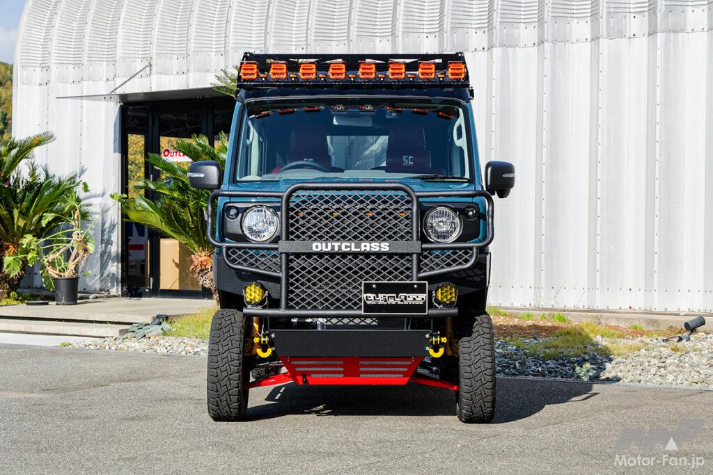 スカニア風ユーロトラックスタイルのシンボルとなるのが、巨大でイカツいグリルガード。もともとはワンオフ製作品だったが、ここにオリジナルのショートバンパーとグリルをセットにして販売することも決定した。ちなみにこの仕様、T.S.Dスタイリングのジムニー顔変身キット、ジムリイのための専用設計。ジムリイなだけでもインパクト特大なのに、そこにスカニア風ブルバーが加わるのだからその攻撃力は強烈だ。ボトムにはアンダーガードもプラスするなど、その戦闘力は破格。ルーフにはハードカーゴのアウトドアキャリアを搭載し、IPFのワークライトもセット。欧州ではトラックたちが夜中に走ることが多いそうで、その空気感を再現。