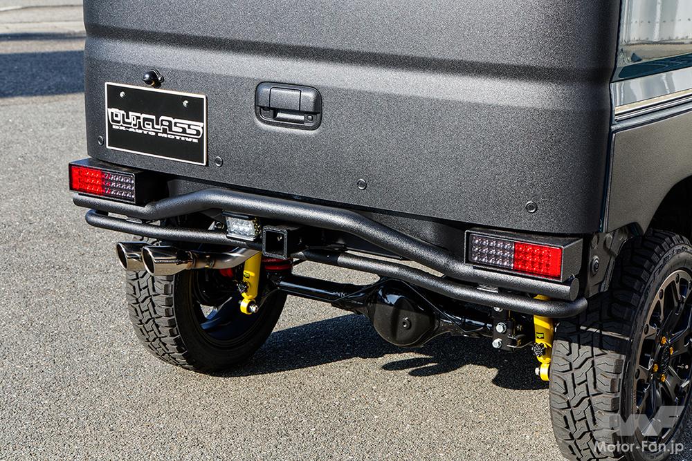 スカニア風のシンボルとなるのは過激で無骨なフェイスまわりだが、リアセクションの攻撃力もなかなかにハイレベル。アイアンバンパーと、突入防止バンパーガードの役目を果たすリアサブバンパーとのコンビはワイルドさが満点で、ゴツッとしたヒッチメンバーが追加されているのもトラック感の演出に効果的だ。ショートバンパーだから足まわりを後続車に見せつけられるのもメリット。アウトクラスとKYB、中央発條が共同開発した4インチリフトアップキットによる大胆なアゲスタイルも大きな見せ場。ナンバープレートの移設やラプターライナー塗装などの細かなアレンジまで、さすがは名匠だ。