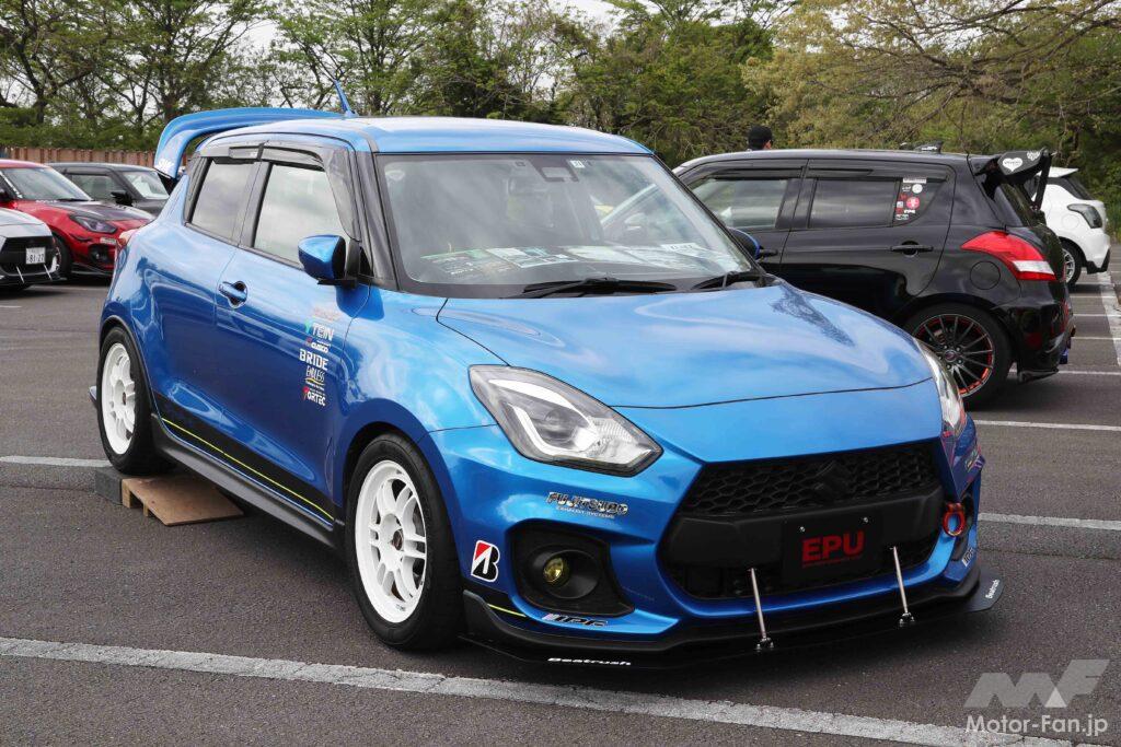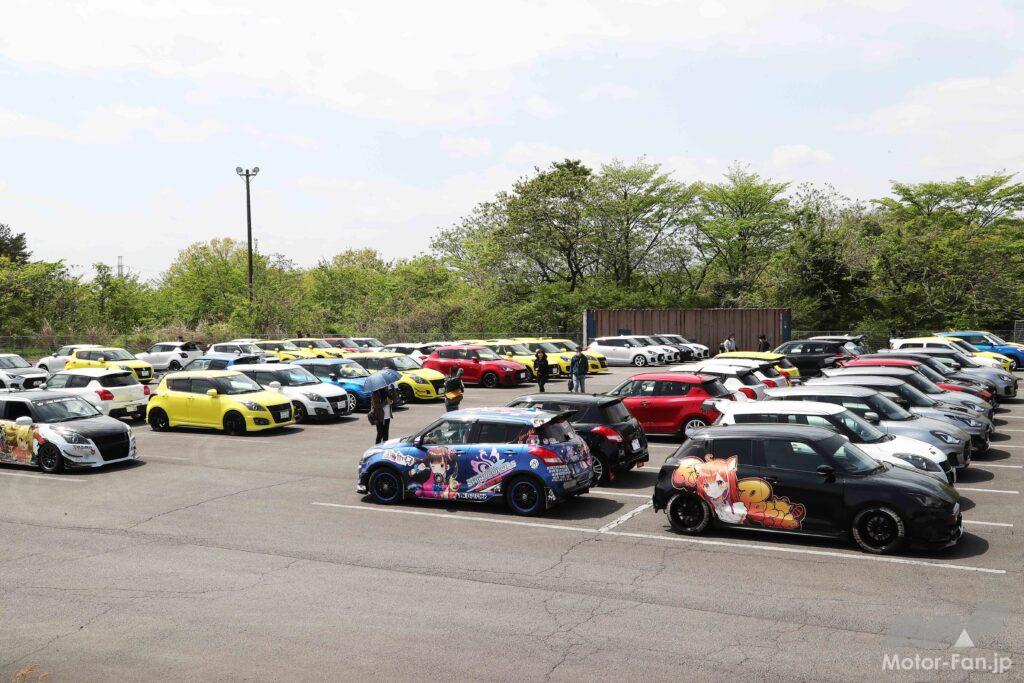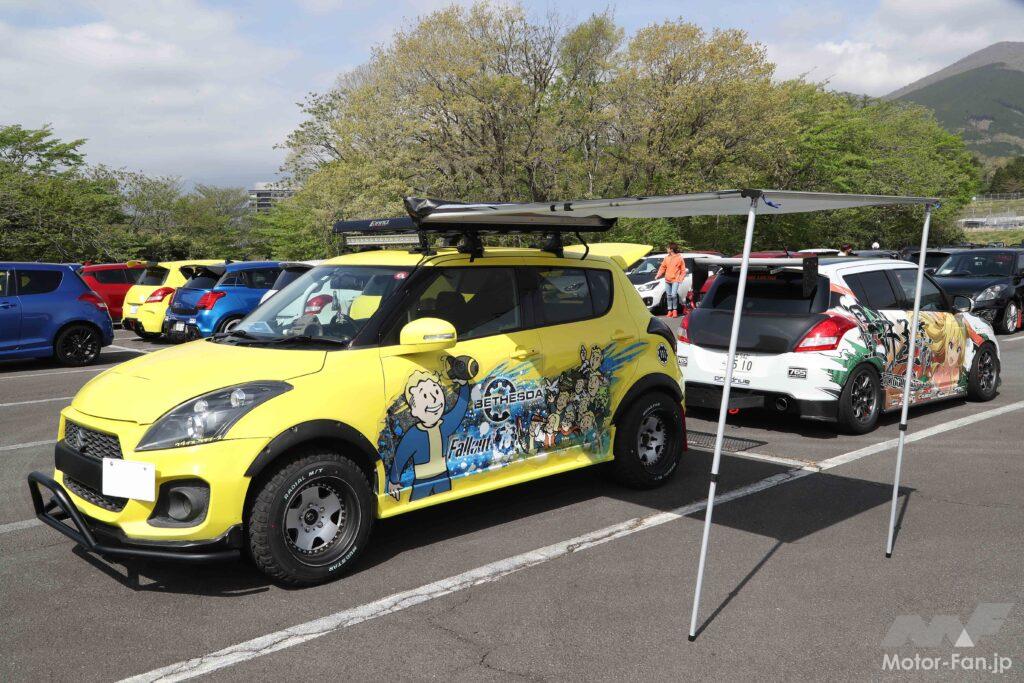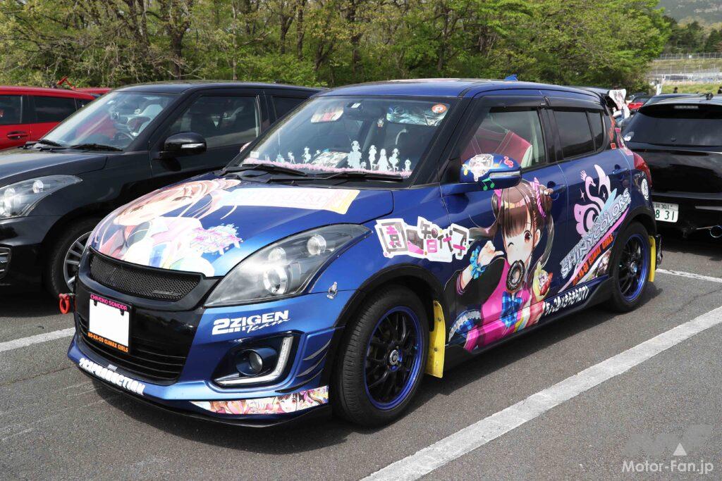 カスタムの素材としても人気のスイフトらしく、カスタム車両も数多く参加していた。走りを楽しめるスイフト・スポーツだけに足回りや吸排気系をチューニングしている車両も多いが、リフトアップしたオフロード仕様や、好きなキャラクターで彩った「痛車」など、個性豊かなカスタムカーの姿も。カスタムを行なっているユーザーのほとんどが、自分で手を加えているとのことで、クルマに対する愛情の深さを感じられた。