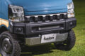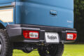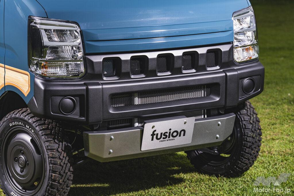ボトムを大胆に切り上げて純正よりも大幅にショート化を実現。ジムニーのイメージをエブリイで存分に楽しめるフュージョンのバンパー。フォグランプはエブリイ純正をそのまま移設でき、本来の機能を失うことはない。リアバンパーも純正のバックセンサーを移設できるように、テールランプの上にフラットな面を設けている。こういうユーザー目線の配慮も嬉しいポイントと言えるだろう。