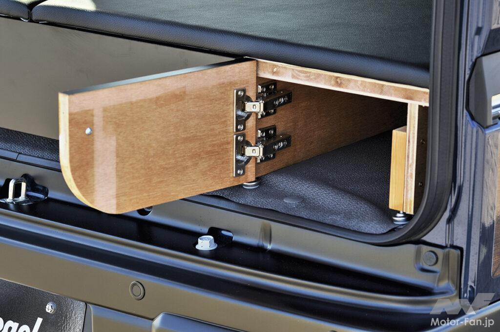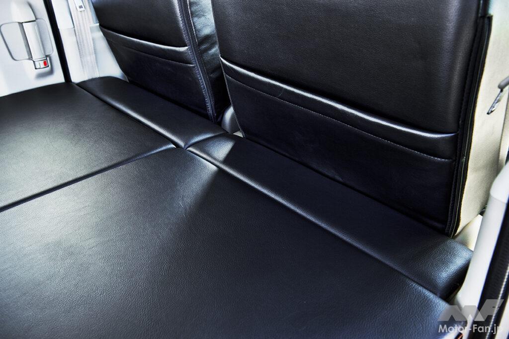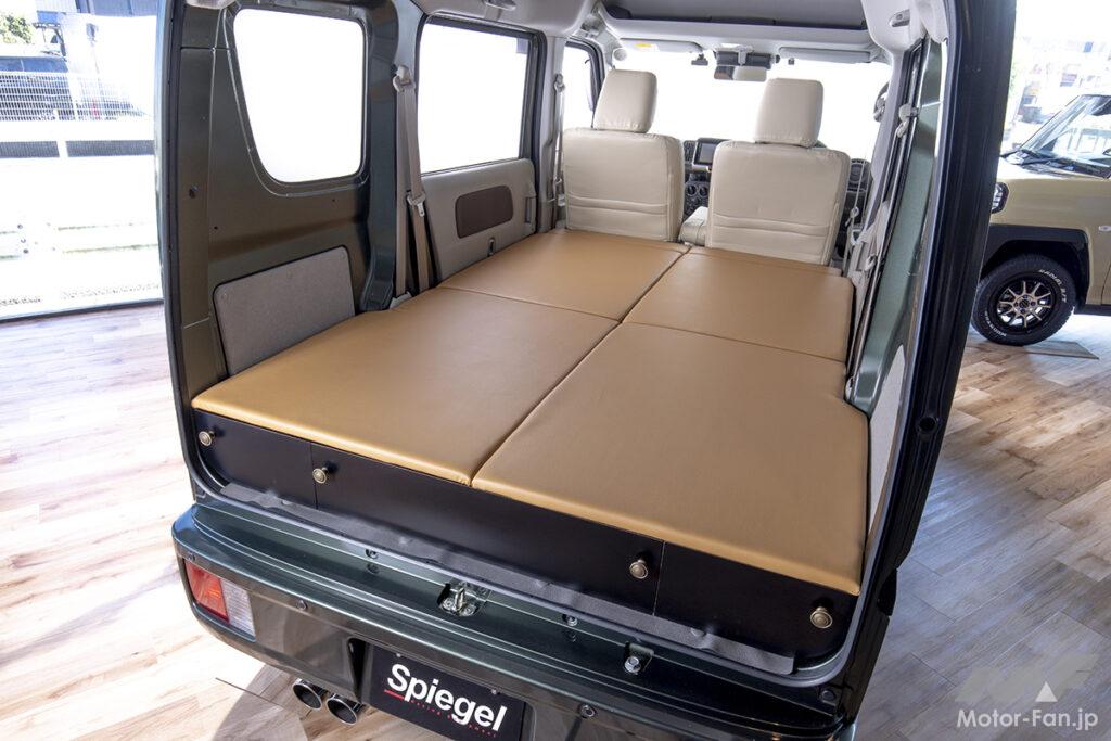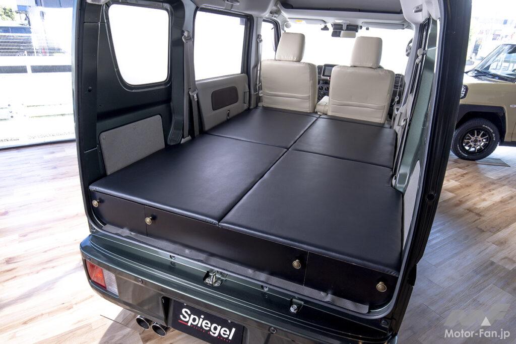 どの軽カーよりも室内空間が広いエブリイは、市販のベッドキットを活用することでより快適に車中泊できる。シュピーゲルのベッドキット「プチ・トマキット」は市販品に見られるパイプのベースを組み込んだものではなく、あたかも純正メーカーが手がけたような違和感のない作りがウリ。しかも国内の工場で生産しているからクオリティも文句なし。ラインアップは2種類から選ぶことができる。天面がフローリング調仕上げのプチ・トマベースキット、そして専用設計のマットが付属したプチ・トマキットだ。もちろんリアシートは簡単に純正復帰でき、外したマットなどのパーツはスマートに隠せるように工夫して製作。そして停車時にベッドスペースを延長できるキットまで付属するなど、まさに至れり尽くせりな仕様となっている。