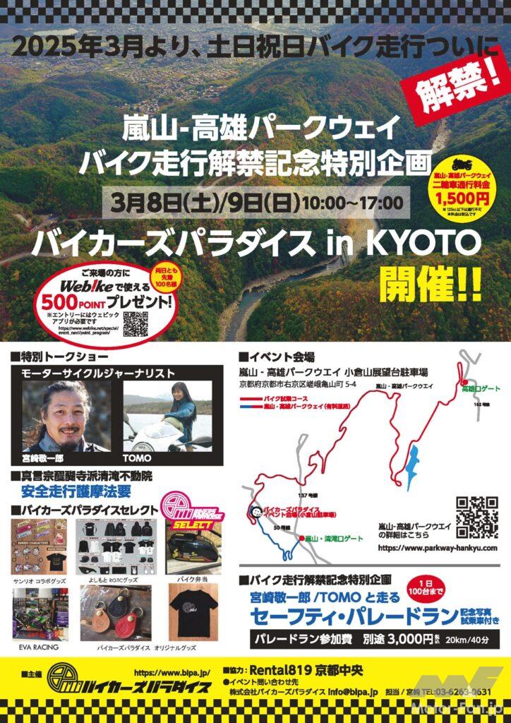 株式会社バイカーズパラダイスと西山ドライブウエイ株式会社は、2025年3月1日より、京都市の嵐山-高雄パークウエイにおいて、40年ぶりに土日祝日のバイク通行を解禁する。この解禁を記念し、3月8日と9日にライダーの安全走行を祈願するイベント「バイカーズパラダイス in KYOTO」を開催する。