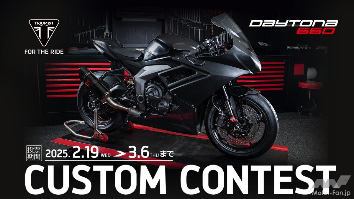 トライアンフモーターサイクルズジャパンは、2025年2月19日から3月6日まで、全国のトライアンフ正規販売店が制作した「DAYTONA 660」のカスタムバイクを対象とした「DAYTONA 660カスタムコンテスト」の投票を実施する。投票は専用ページから行え、参加者の中から抽選で20名にトライアンフオリジナルグッズがプレゼントされる。優勝車両は、3月21日から23日にインテックス大阪で開催される「大阪モーターサイクルショー2025」と、3月28日から30日に東京ビッグサイトで開催される「東京モーターサイクルショー2025」のトライアンフブースに展示される予定だ。
