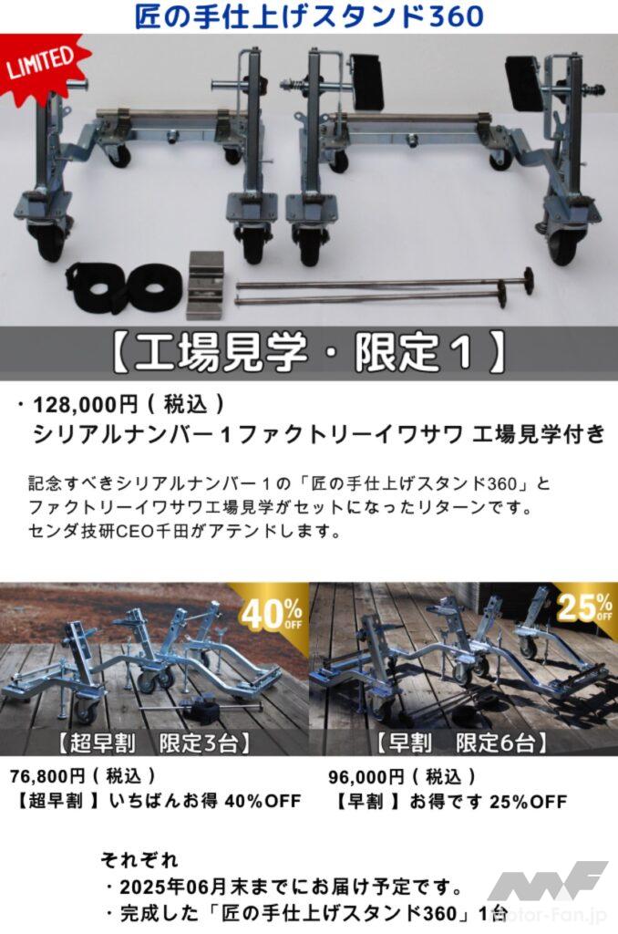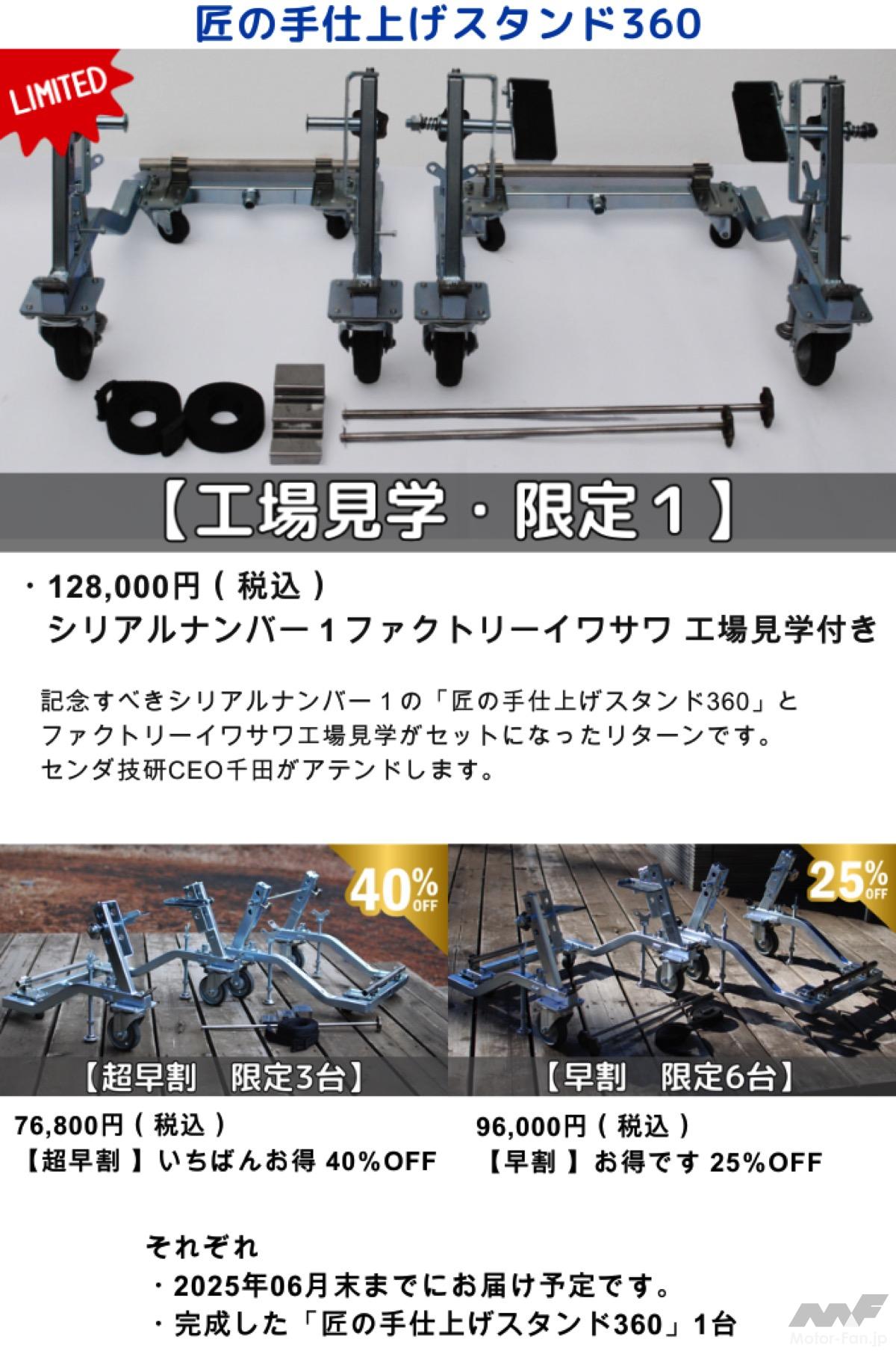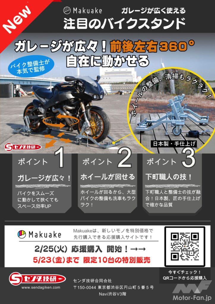 センダ技研は、狭いガレージでもバイクを360°自由に動かせる「匠の手仕上げスタンド360」を開発し、2025年2月25日からクラウドファンディングプラットフォーム「Makuake」でプロジェクトを開始する。このスタンドは、バイクを前後左右だけでなく、360°回転させることが可能で、狭いガレージ内でのバイクの移動や整備を容易にする。また、スタンドに乗せたままホイールの回転ができるため、チェーン清掃やホイール磨きなどのメンテナンス作業も快適に行える。さらに、レベルアジャスターを備えており、長期保管時には半固定状態にすることができる。この製品は、東京都江東区の町工場「ファクトリーイワサワ」の職人技と、バイク開発歴35年のエンジニア・千田明生氏の専門知識が融合して生まれた。Makuakeプロジェクトでは、最大40%オフの特別価格で提供され、初日限定の5,000円オフクーポンも配布される。詳細はセンダ技研の公式サイトやLINE公式ページで確認できる。