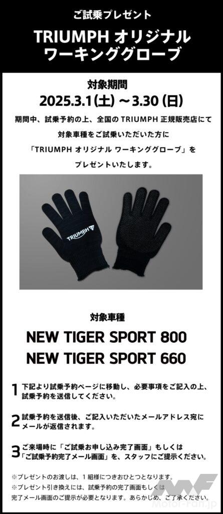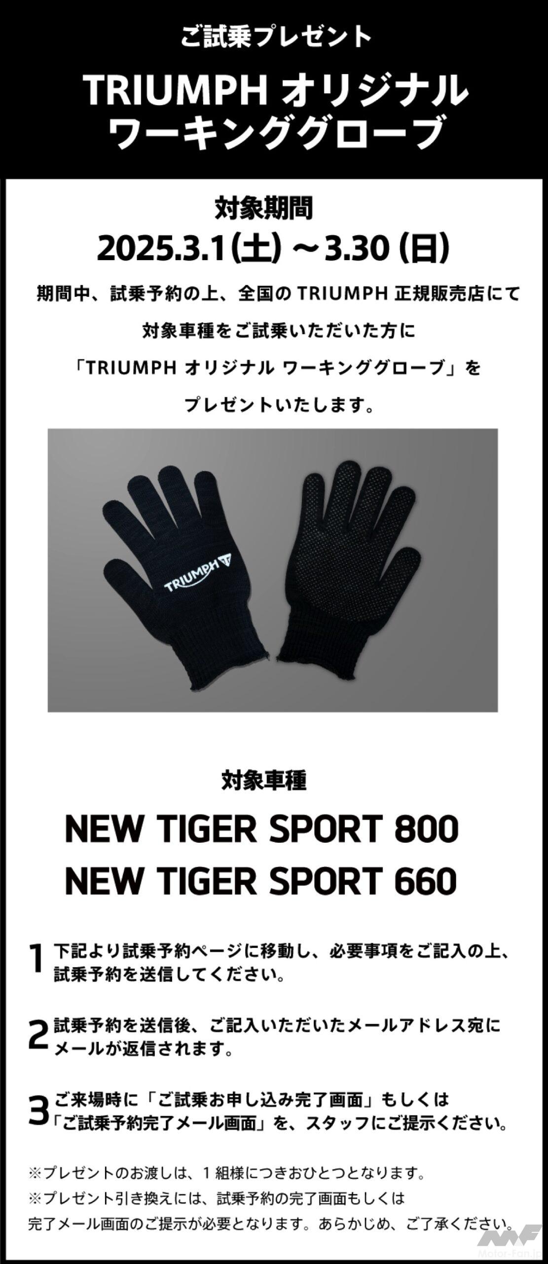 トライアンフモーターサイクルズジャパンは、2025年3月1日から3月30日まで、全国のトライアンフ正規販売店にて「TIGER SPORT 800/660 FAIR」を開催する。期間中、対象モデルの試乗予約を行い、実際に試乗した方には「TRIUMPH オリジナル ワーキンググローブ」をプレゼントする。TIGER SPORT 800および660は、パワフルな3気筒エンジンと優れたハンドリング性能を備え、街乗りからロングツーリングまで幅広く対応するアドベンチャースポーツツアラーである。この機会に、全国の正規販売店でその魅力を体感してほしい。